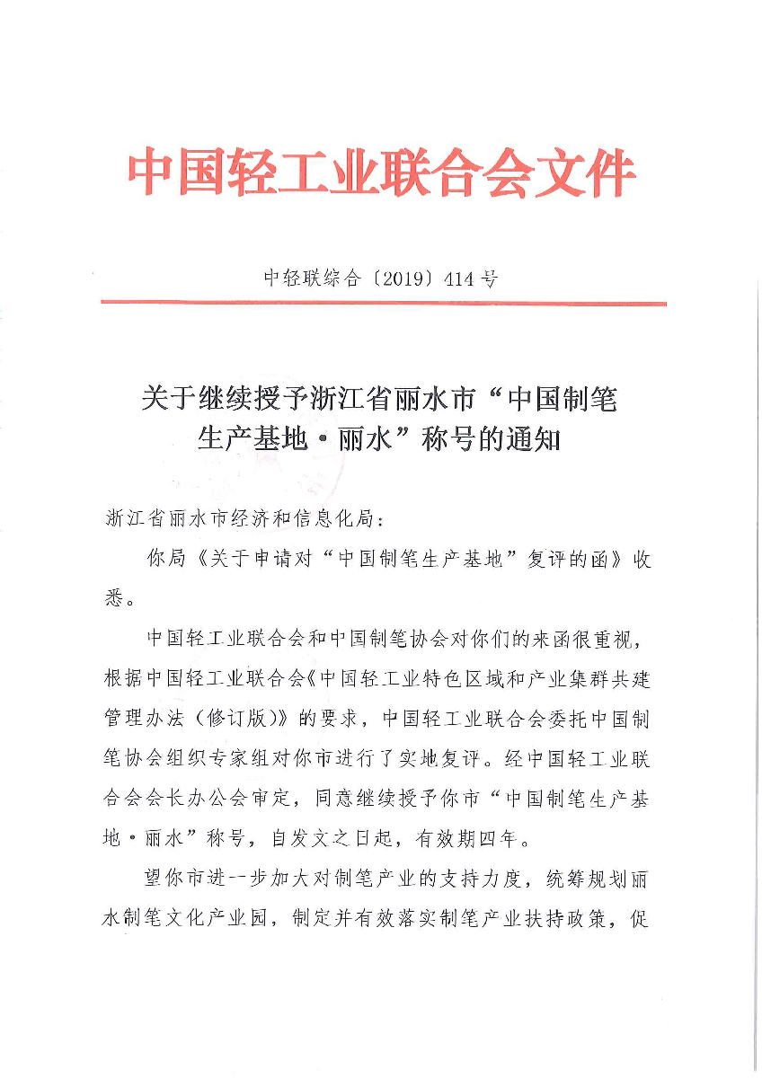 關于繼續(xù)授予浙江省麗水市“中國制筆生產基地·麗水”稱號的通知