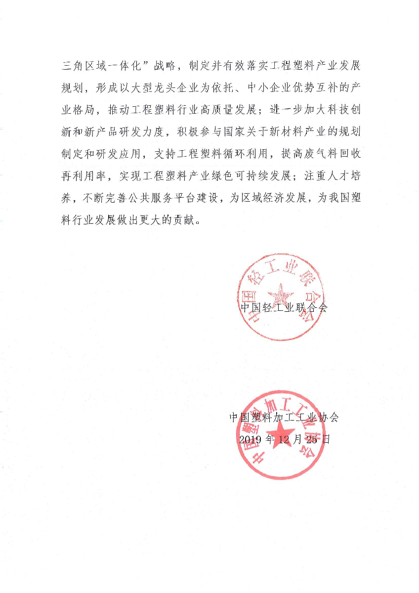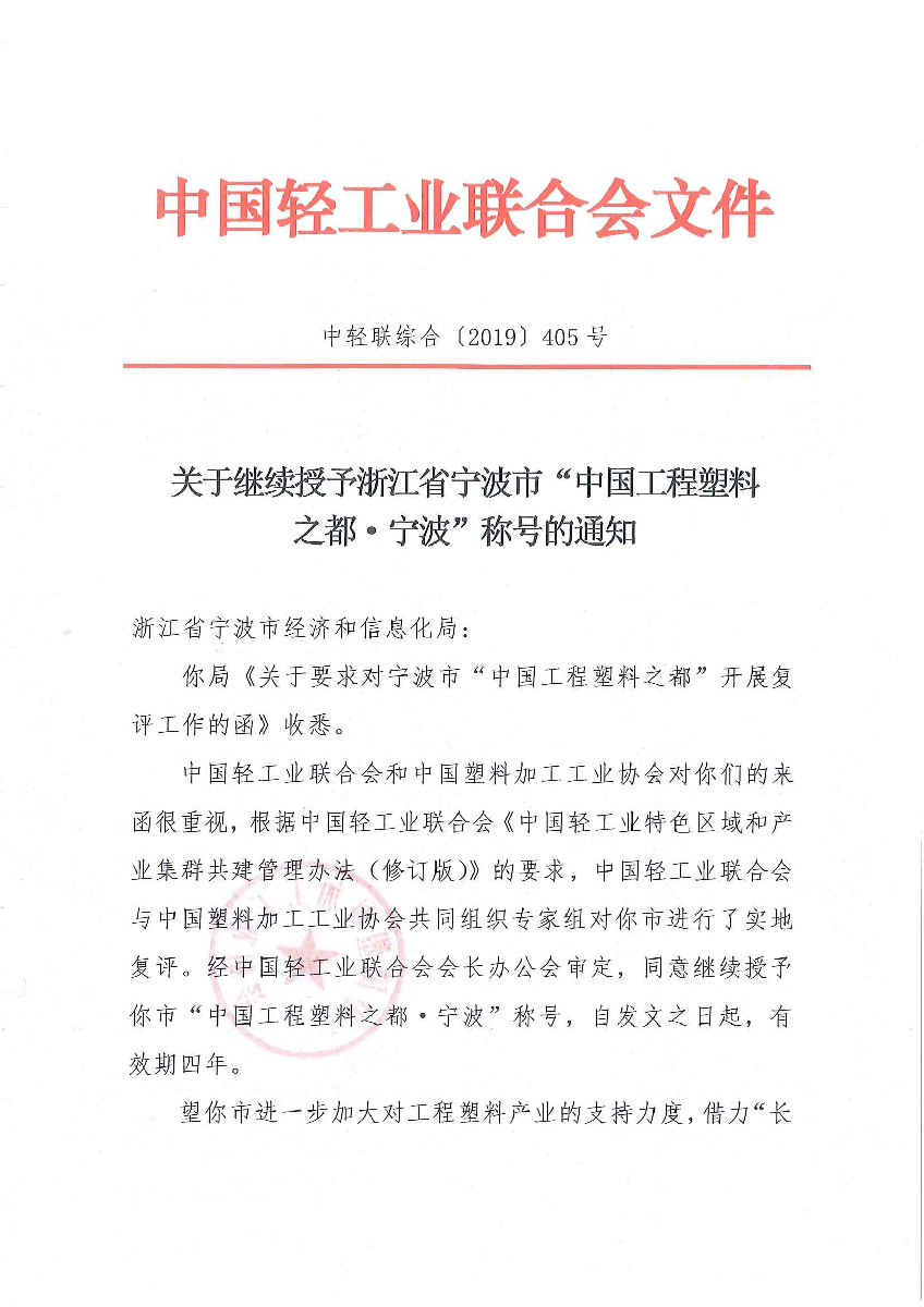 關(guān)于繼續(xù)授予浙江省寧波市“中國工程塑料之都·寧波”稱號的請示