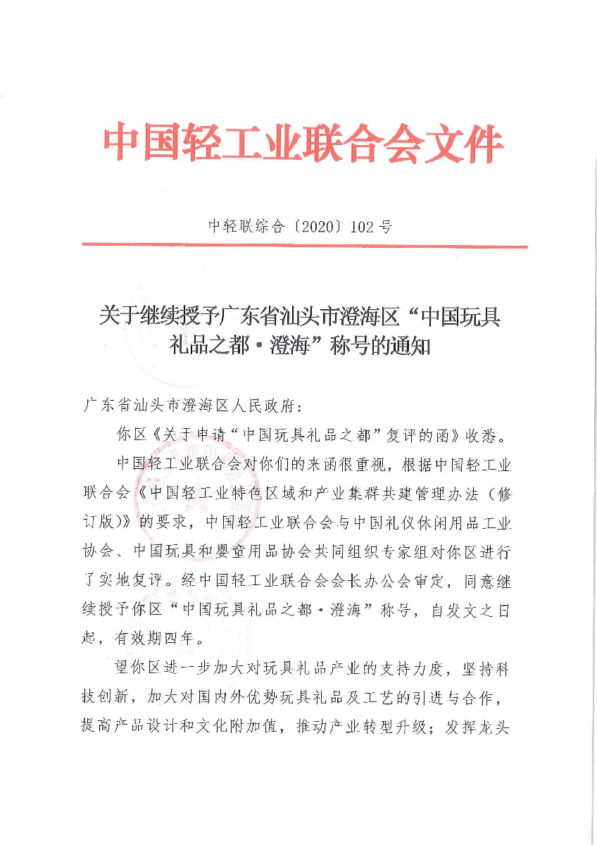 關(guān)于繼續(xù)授予廣東省汕頭市澄海區(qū)“中國玩具禮品之都·澄?!狈Q號(hào)的通知