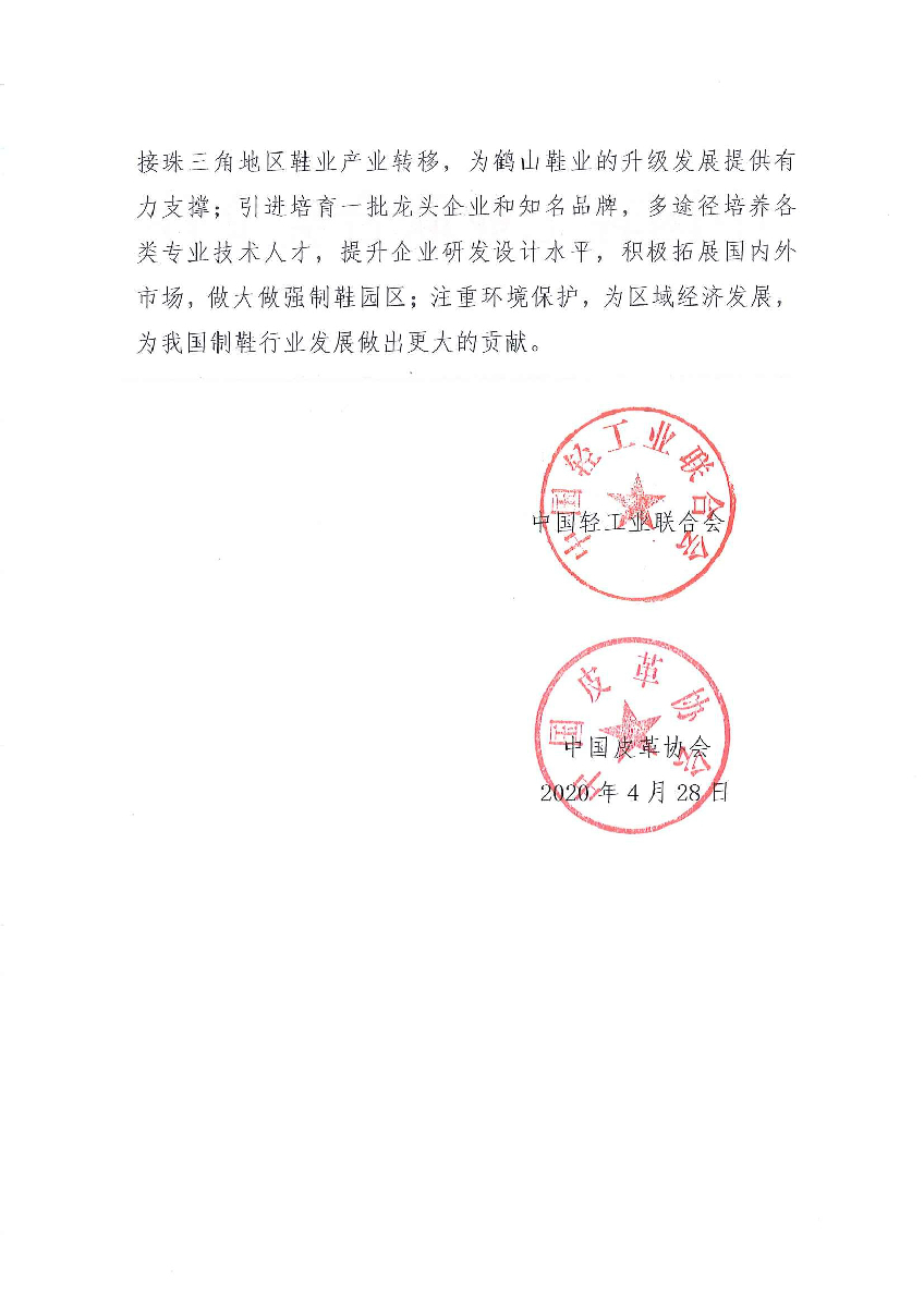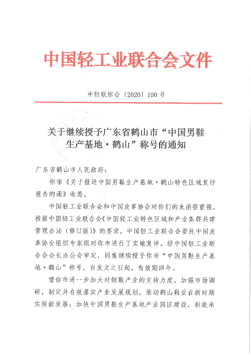 關(guān)于繼續(xù)授予廣東省鶴山市“中國男鞋生產(chǎn)基地·鶴山”稱號的通知
