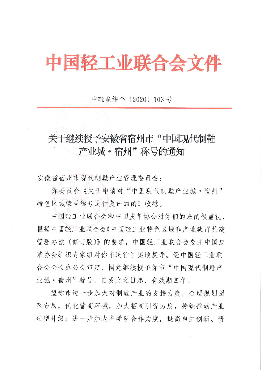 關(guān)于繼續(xù)授予安徽省宿州市“中國(guó)現(xiàn)代制鞋產(chǎn)業(yè)城·宿州”稱(chēng)號(hào)的通知
