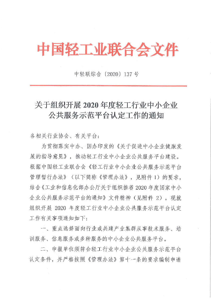 為貫徹落實中辦、國辦印發(fā)的《關于促進中小企業(yè)健康發(fā)展的指導意見》,推動輕工行業(yè)中小企業(yè)公共服務平臺建設,根據(jù)中國輕工業(yè)聯(lián)合會《輕工行業(yè)中小企業(yè)公共服務示范平臺管理暫行辦法》(以下簡稱《管理辦法》,見附件1)的要求,結合《工業(yè)和信息化部辦公廳關于組織推薦2020年度國家中小企業(yè)公共服務示范平臺的通知》文件精神(見附件2),現(xiàn)就組織開展2020年度輕工行業(yè)中小企業(yè)公共服務示范平臺認定工作有關事項通知如下: