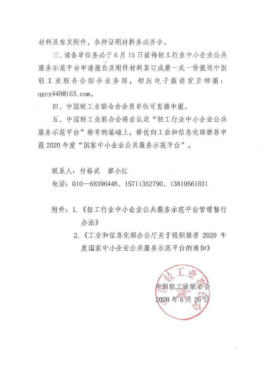 三、請各單位務必于6月15日前將輕工行業(yè)中小企業(yè)公共服務示范平臺申請報告及附件材料裝訂成冊一式一份報送中國輕工業(yè)聯(lián)合會綜合業(yè)務部,相應電子版請發(fā)至郵箱:qgcy448@163.com。