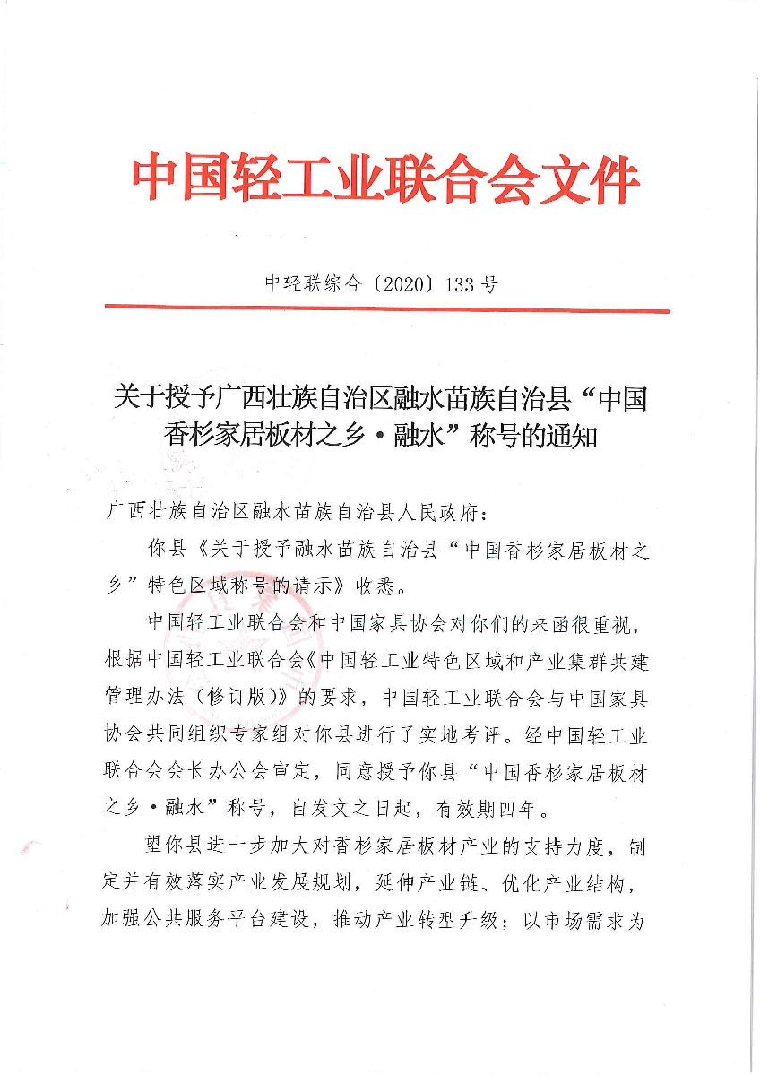 關(guān)于授予廣西壯族自治區(qū)融水苗族自治縣“中國(guó)香杉家居板材之鄉(xiāng)·融水”稱(chēng)號(hào)的通知
