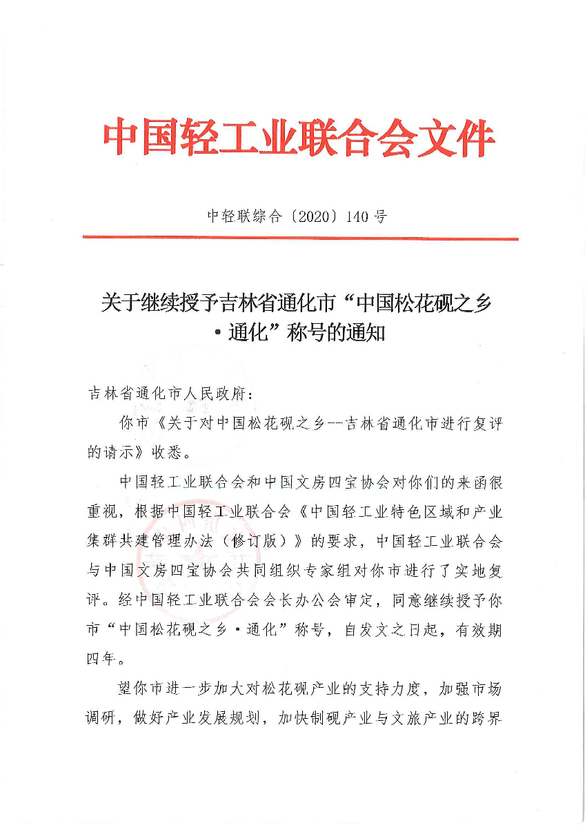 關(guān)于繼續(xù)授予吉林省通化市“中國松花硯之鄉(xiāng)·通化”稱號的通知