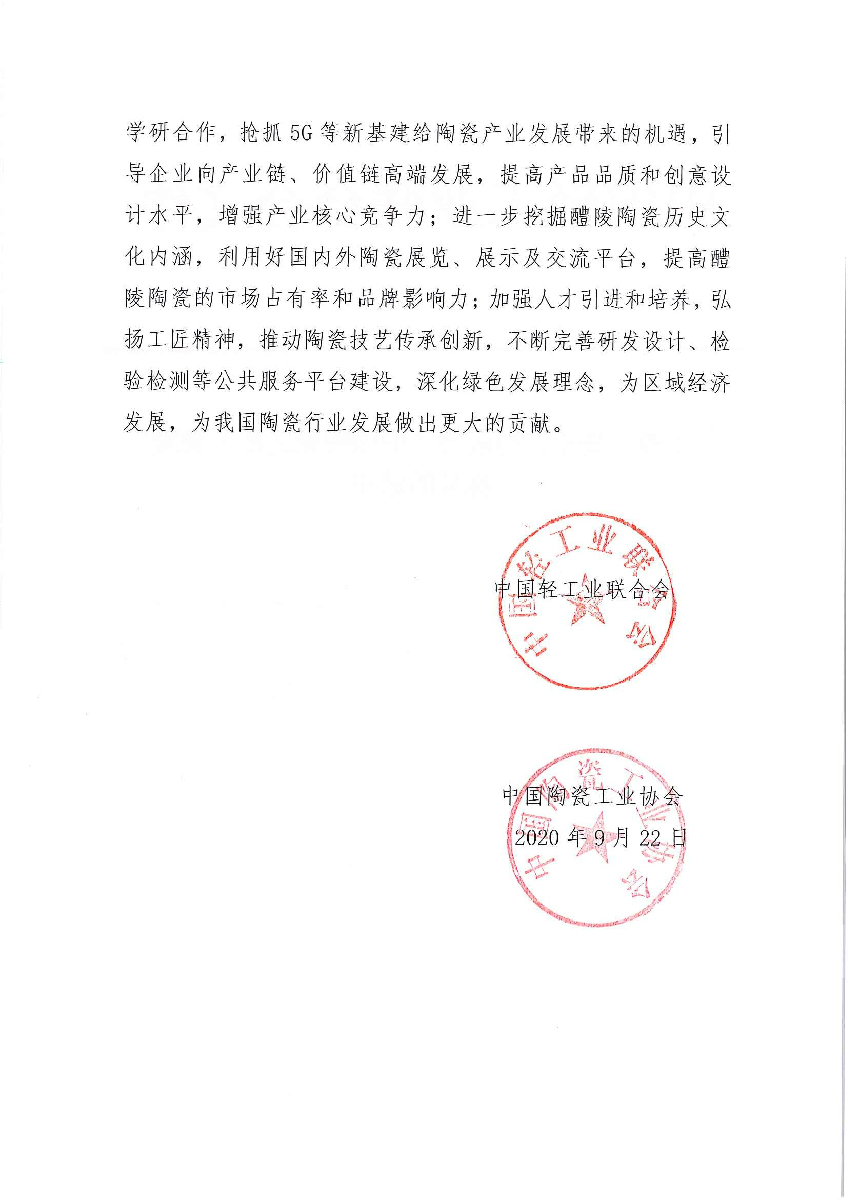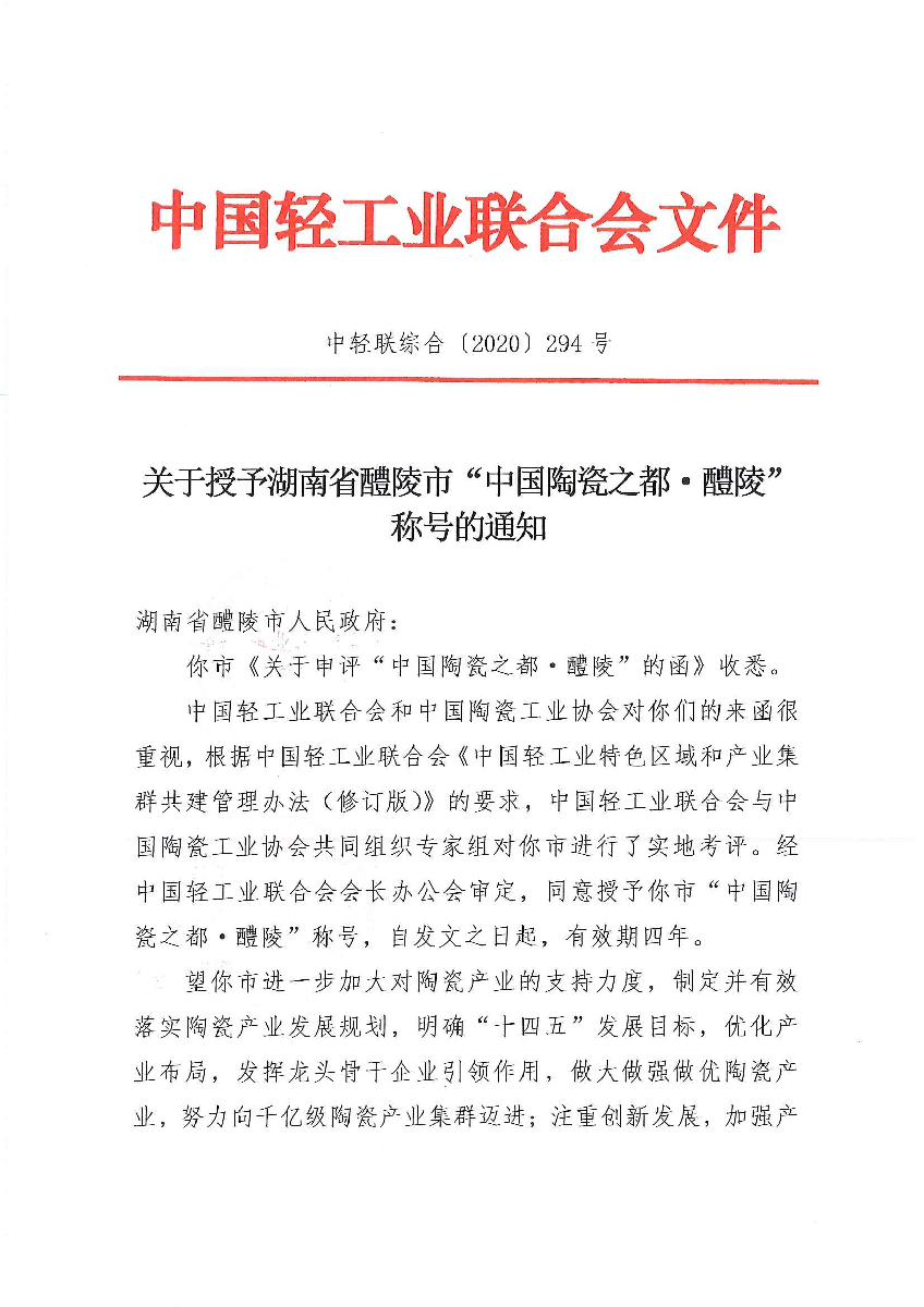 關(guān)于授予湖南省醴陵市“中國陶瓷之都·醴陵”稱號(hào)的通知