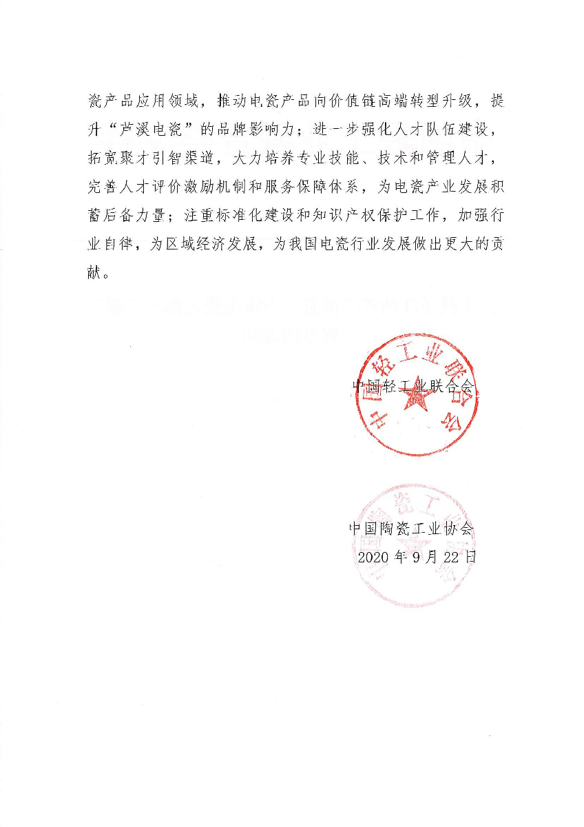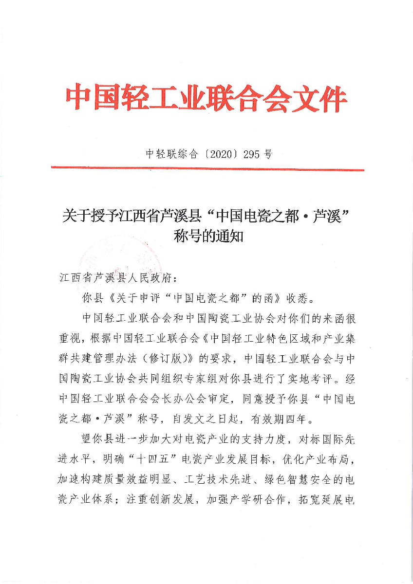 關(guān)于授予江西省蘆溪縣“中國(guó)電瓷之都·蘆溪”稱號(hào)的通知