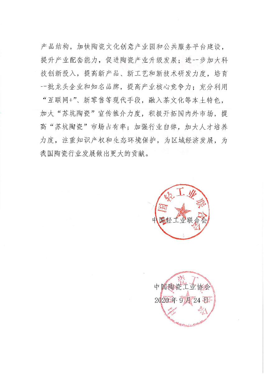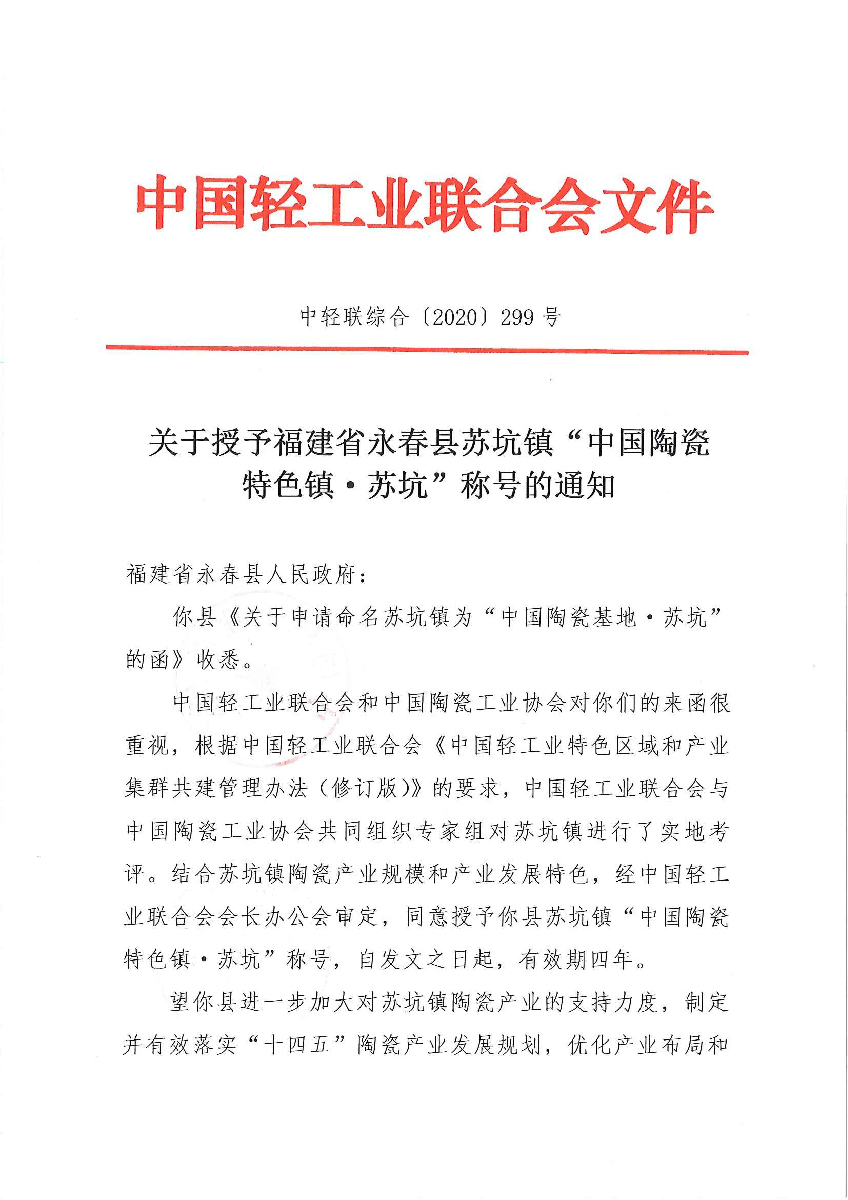 關(guān)于授予福建省永春縣蘇坑鎮(zhèn)“中國陶瓷特色鎮(zhèn)·蘇坑”稱號的通知