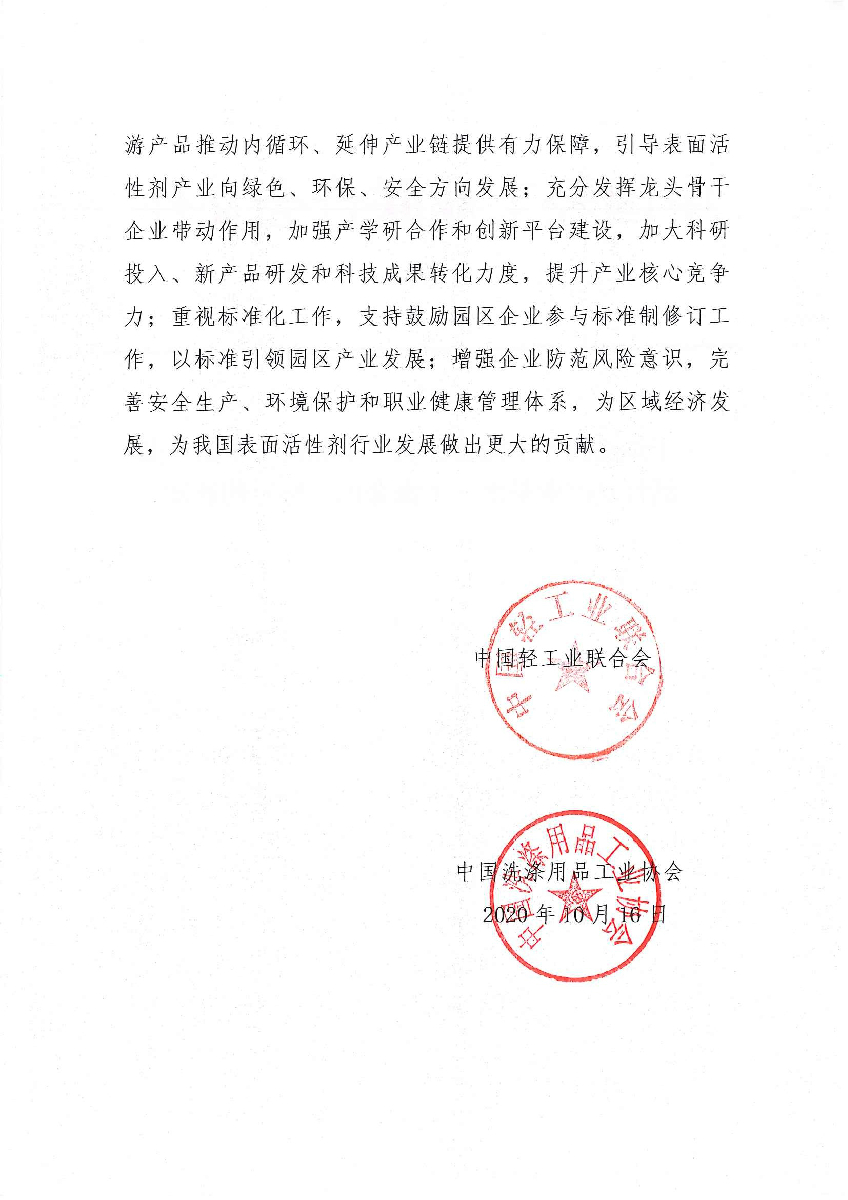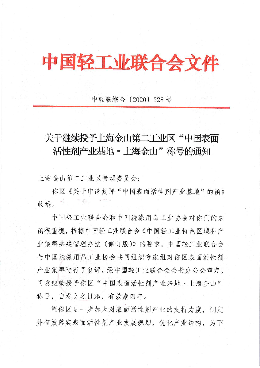 關(guān)于繼續(xù)授予上海金山第二工業(yè)區(qū)“中國表面活性劑產(chǎn)業(yè)基地·上海金山”稱號的通知