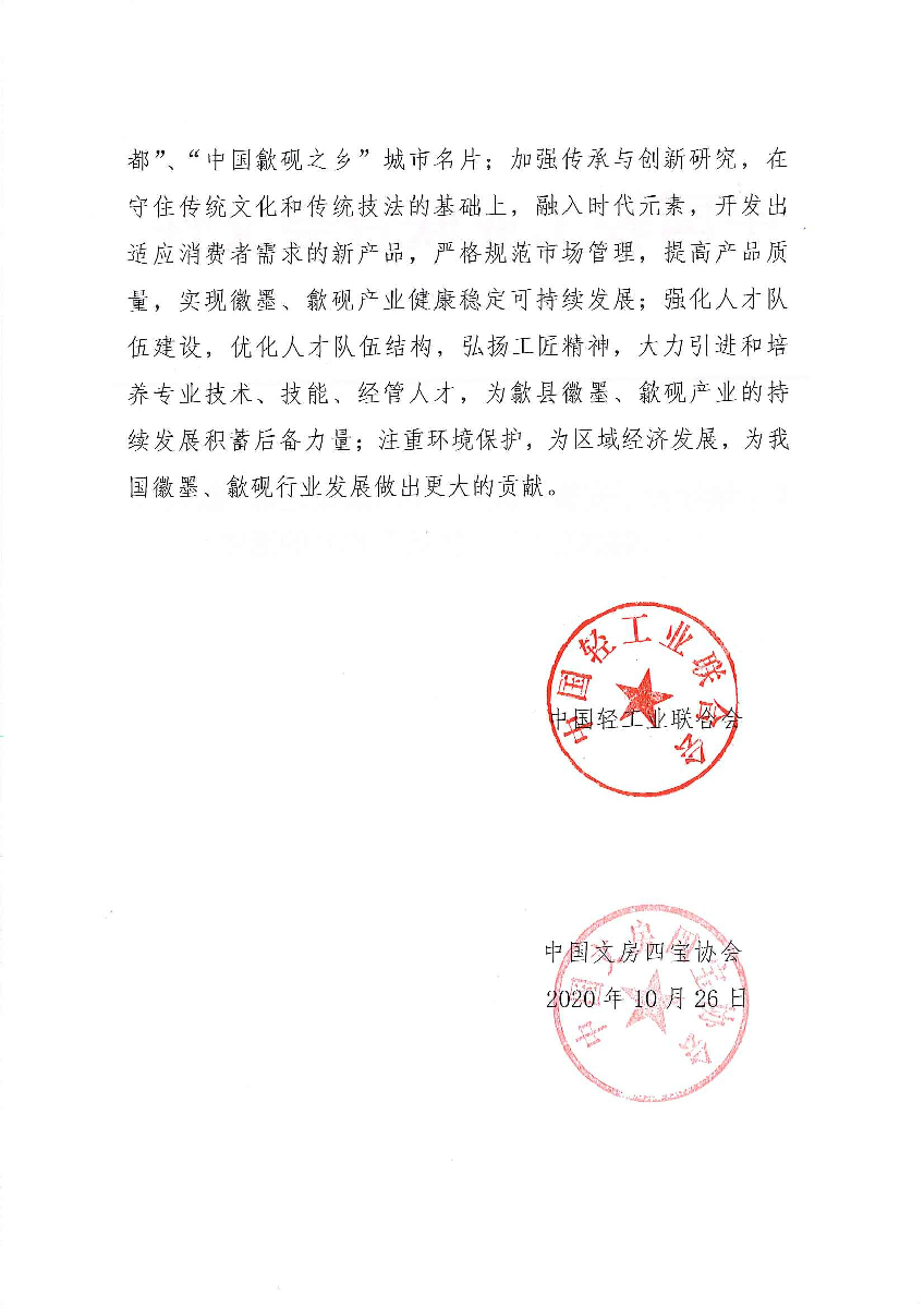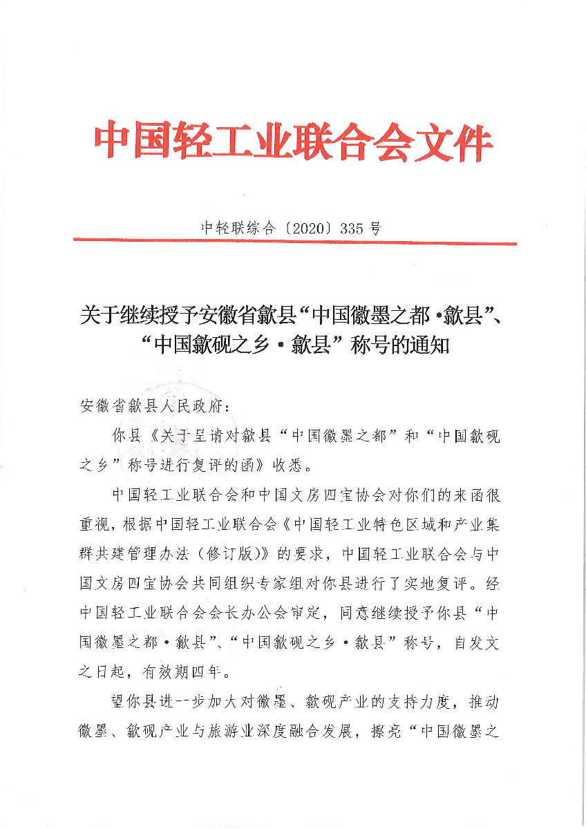 關于繼續(xù)授予安徽省歙縣“中國徽墨之都·歙縣”、“中國歙硯之鄉(xiāng)·歙縣”稱號的通知