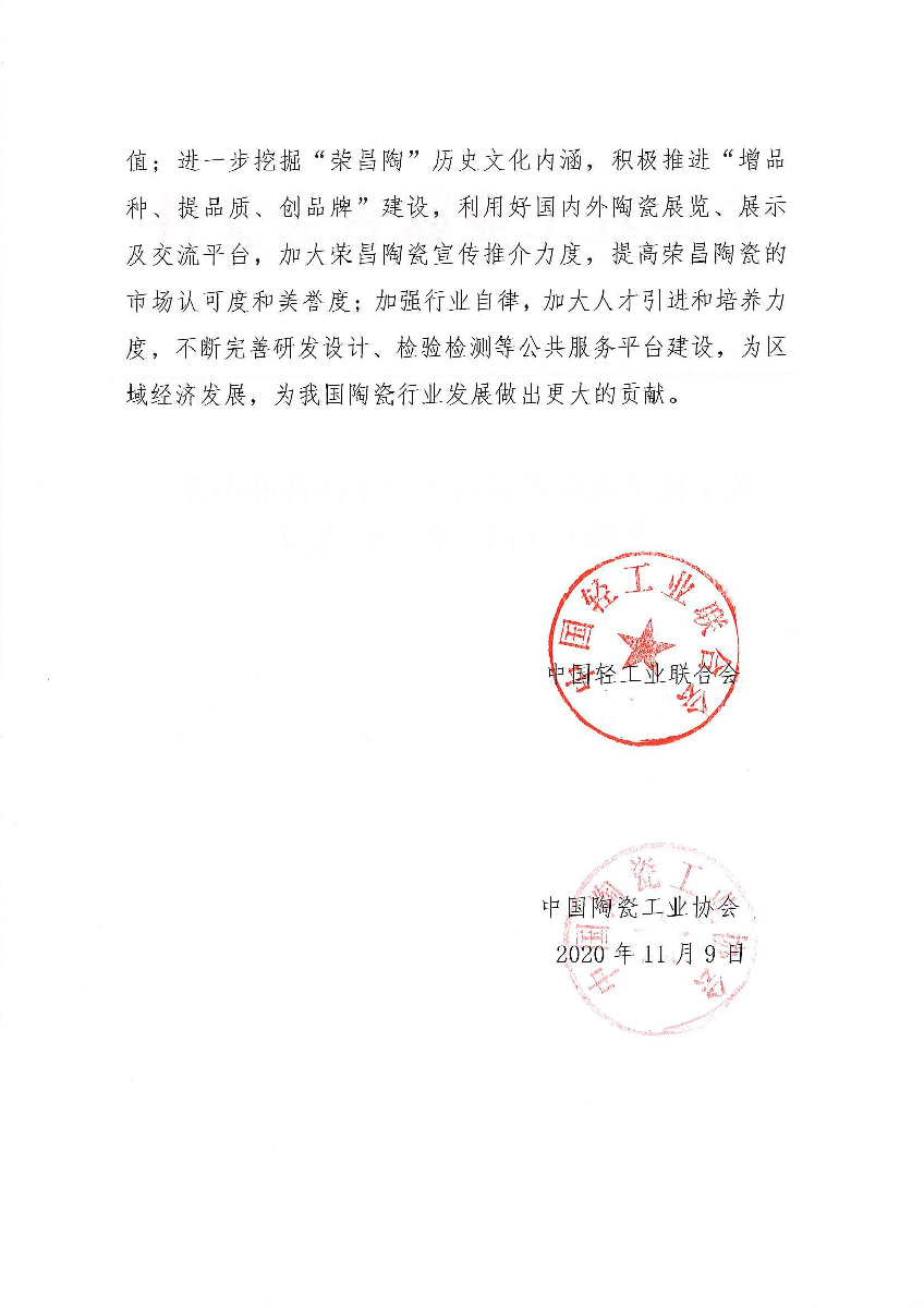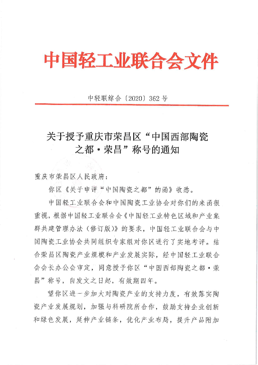 關(guān)于授予重慶市榮昌區(qū)“中國西部陶瓷之都·榮昌”稱號的通知