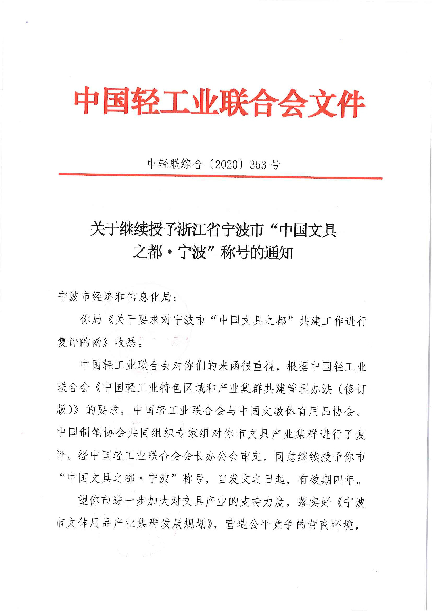 關(guān)于繼續(xù)授予浙江省寧波市“中國文具之都·寧波”稱號(hào)的通知