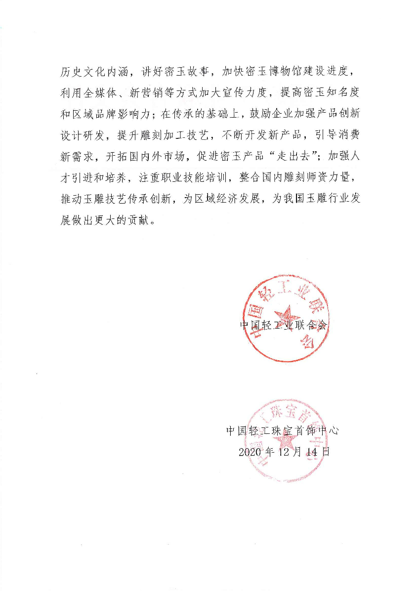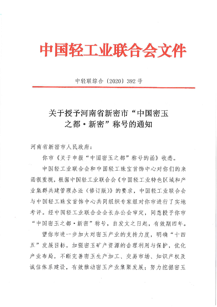 關于授予河南省新密市“中國密玉之都·新密”稱號的通知