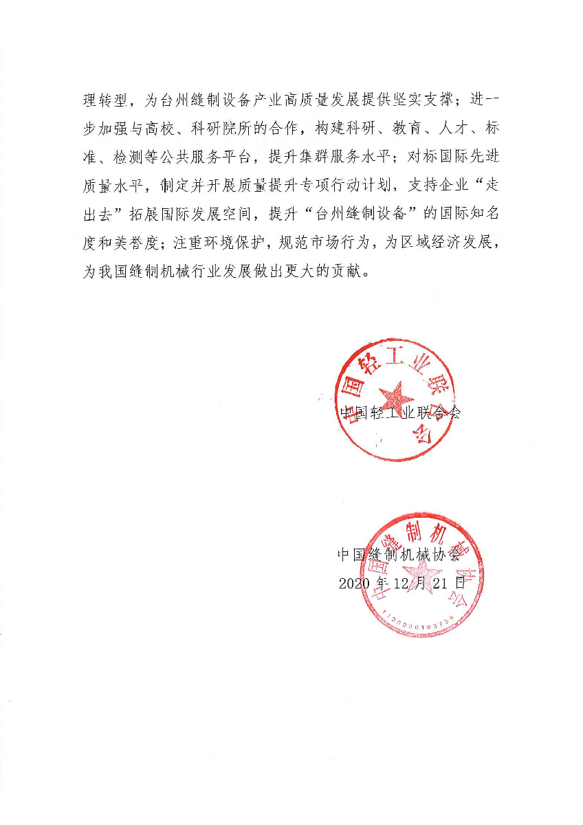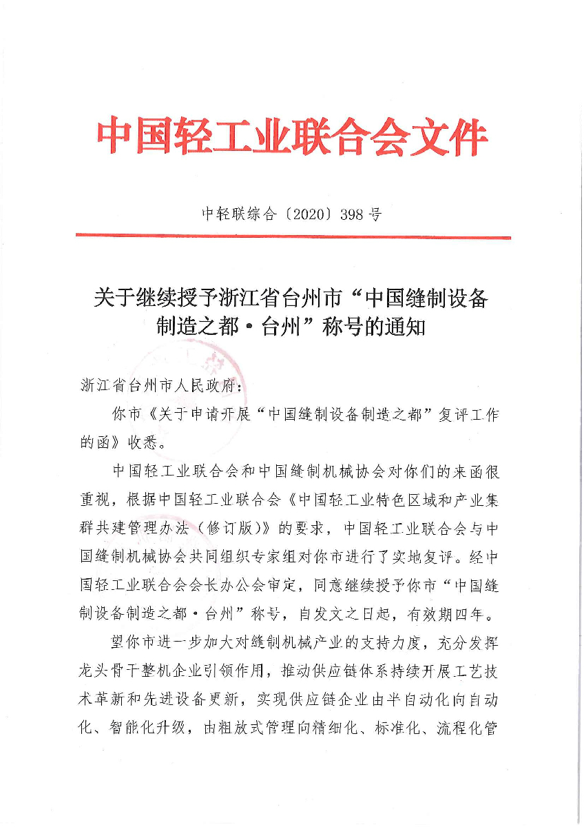 關于繼續(xù)授予浙江省臺州市“中國縫制設備制造之都·臺州”稱號的通知
