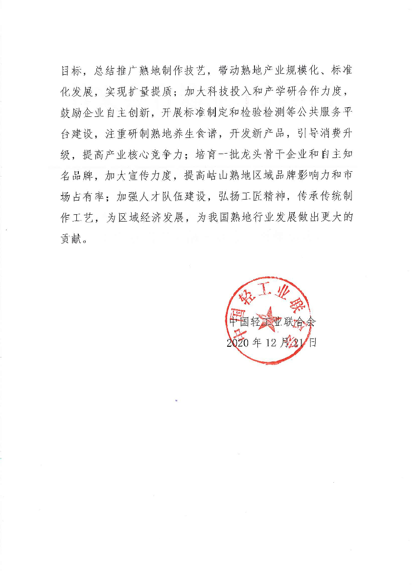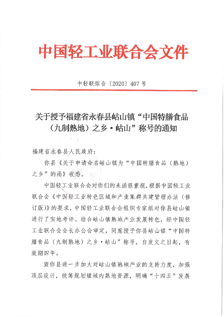 關(guān)于授予福建省永春縣岵山鎮(zhèn)“中國特色食品(九制熟地)之鄉(xiāng)·岵山”稱號的通知