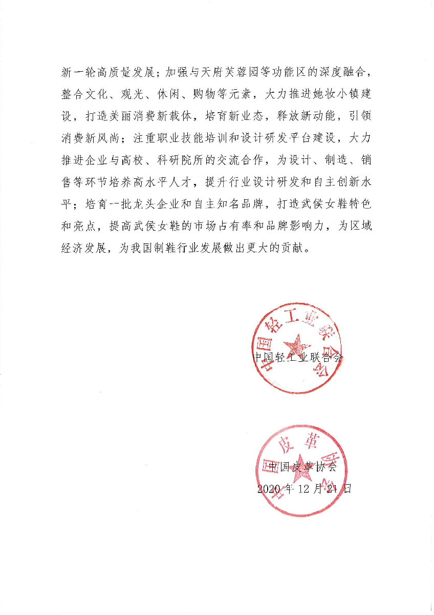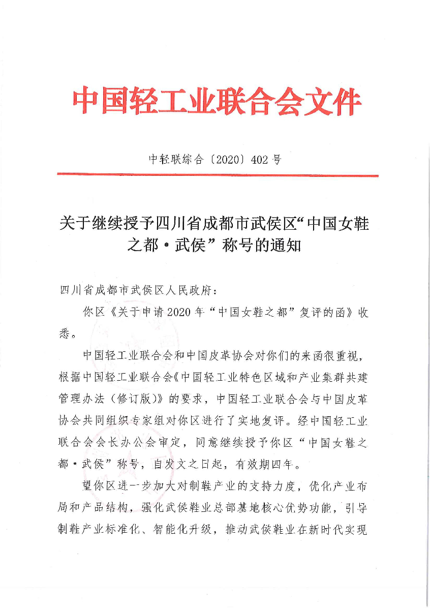 關(guān)于繼續(xù)授予四川省成都市武侯區(qū)“中國女鞋之都·武侯”稱號的通知