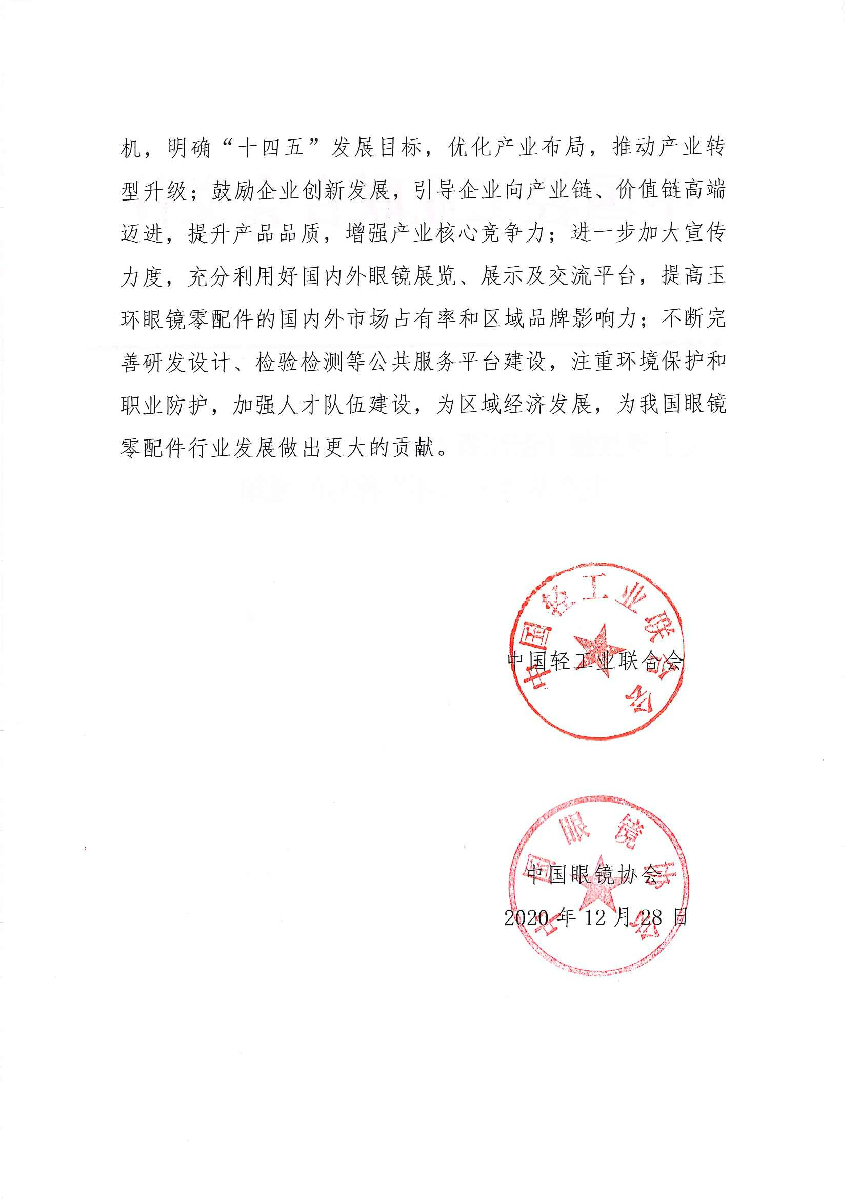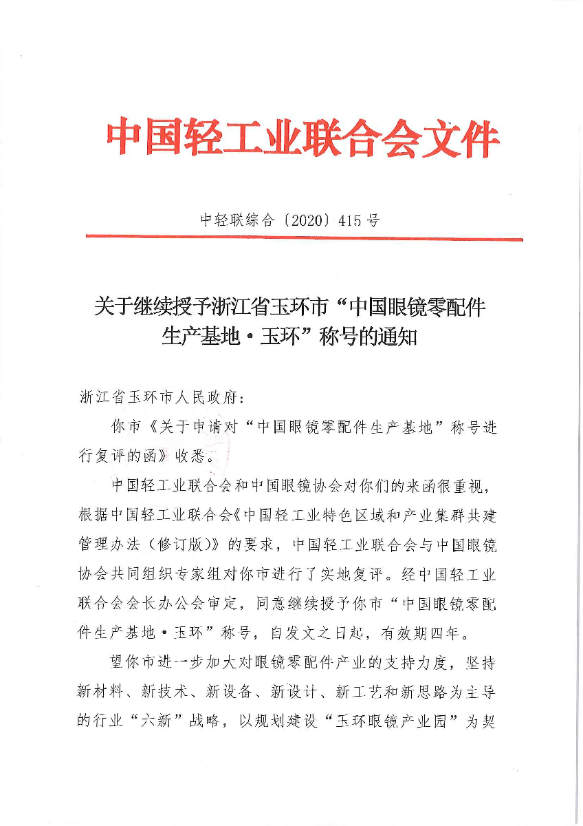 關(guān)于繼續(xù)授予浙江省玉環(huán)市“中國(guó)眼鏡零配件生產(chǎn)基地·玉環(huán)”稱號(hào)的通知