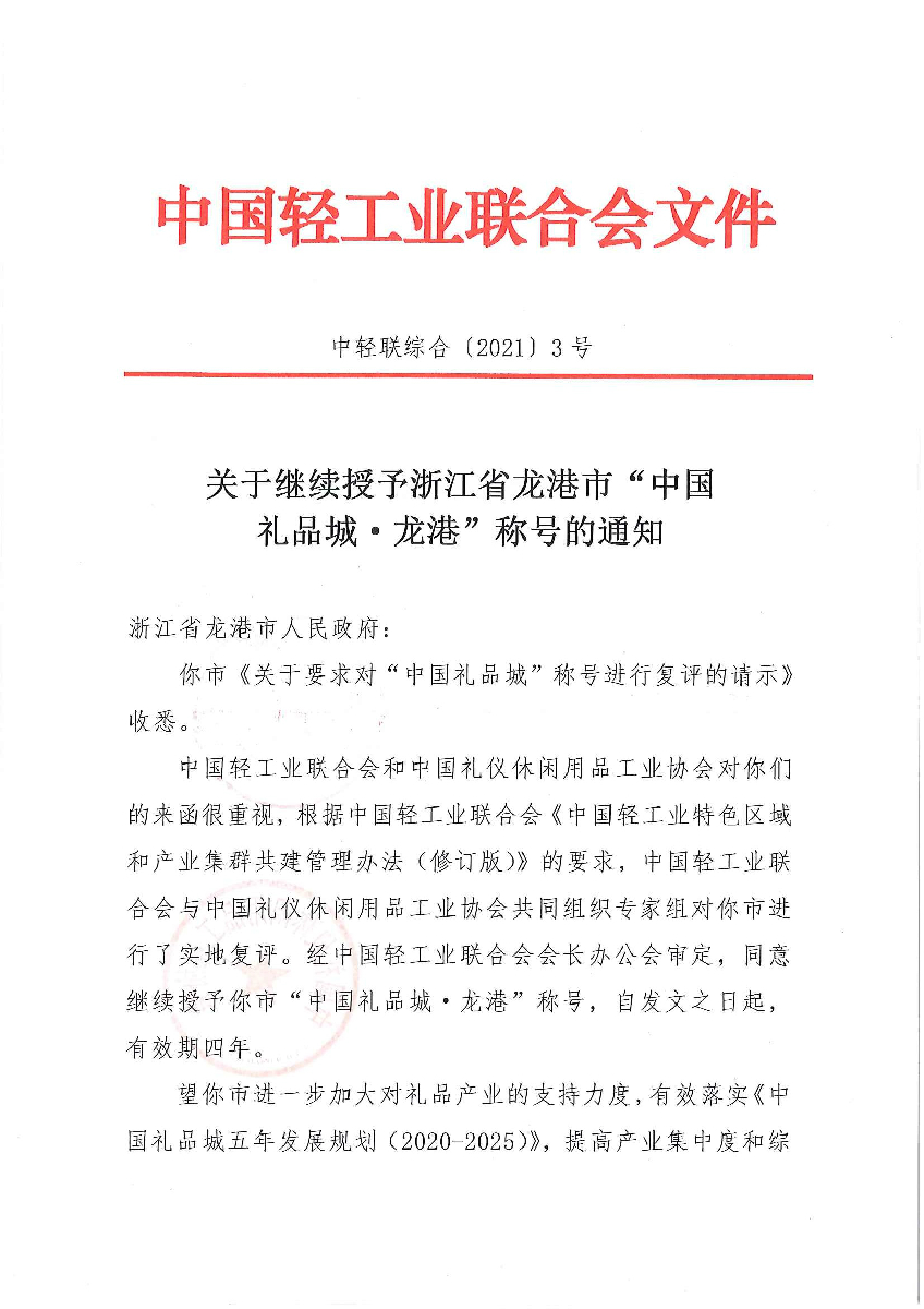 關(guān)于繼續(xù)授予浙江省龍港市“中國禮品城·龍港”稱號的通知