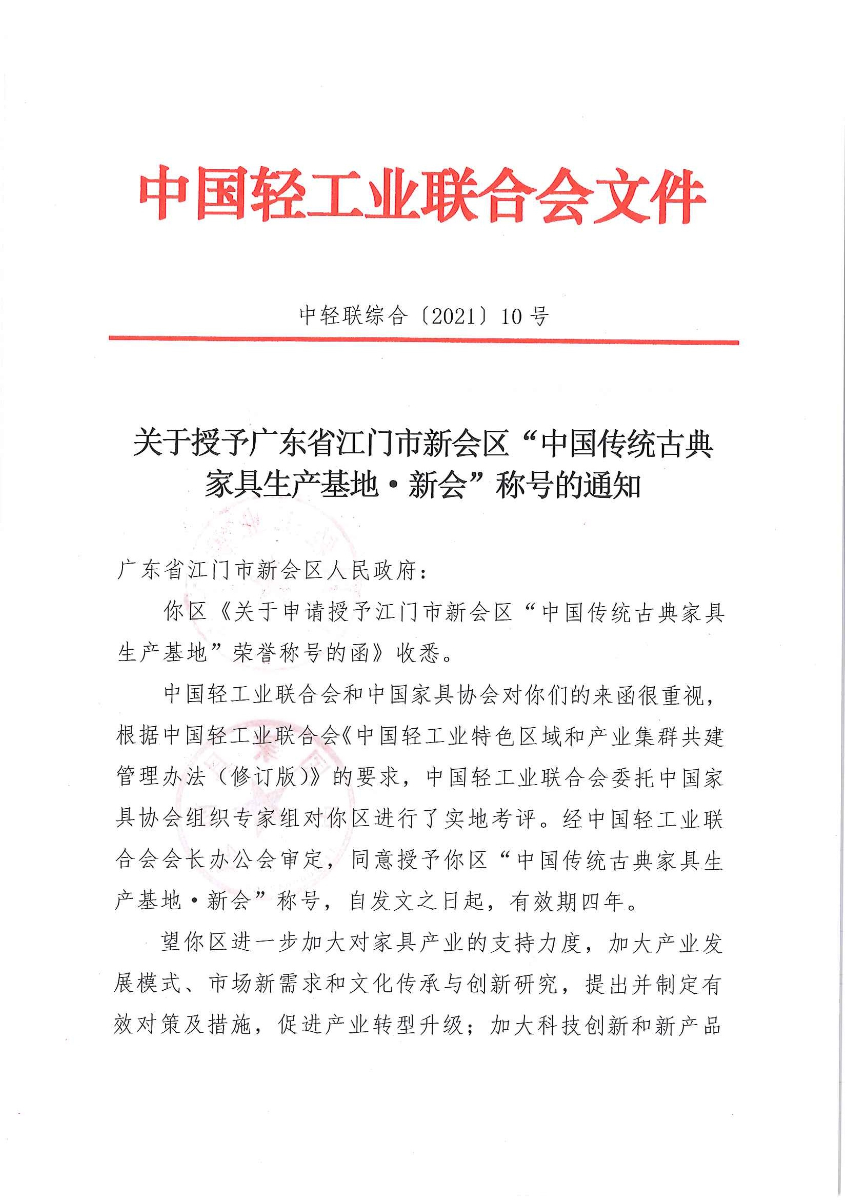 關(guān)于授予廣東省江門(mén)市新會(huì)區(qū)“中國(guó)傳統(tǒng)古典家具生產(chǎn)基地·新會(huì)”稱號(hào)的通知
