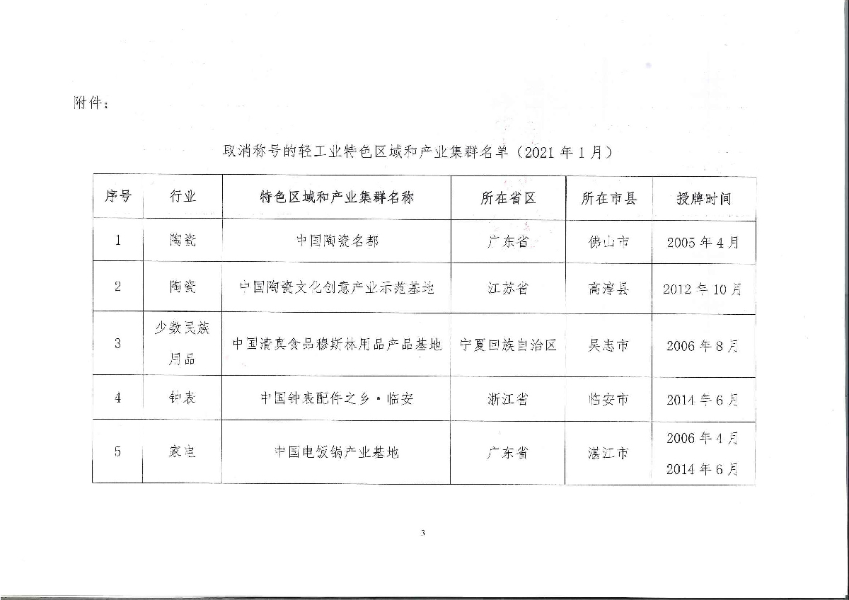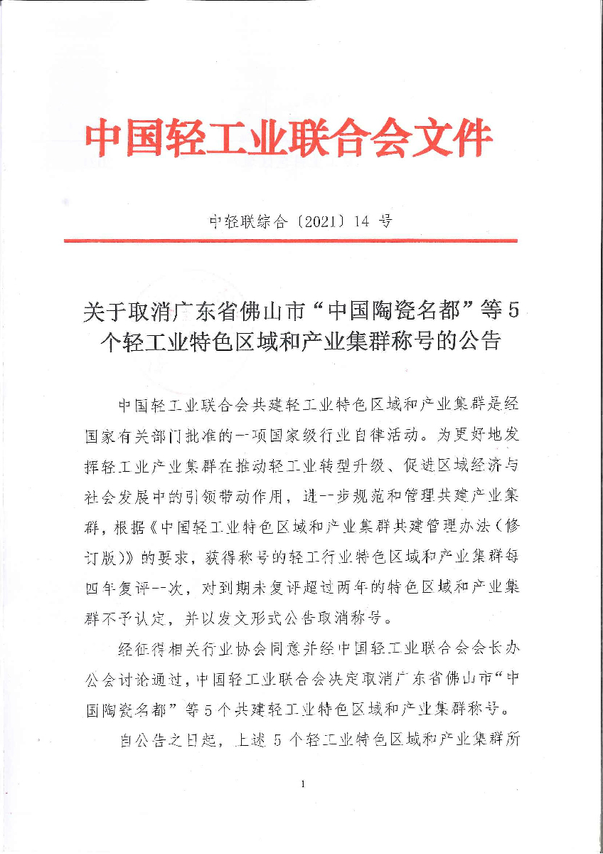 關(guān)于取消廣東省佛山市“中國陶瓷名都”等5個輕工業(yè)特色區(qū)域和產(chǎn)業(yè)集群稱號的公告