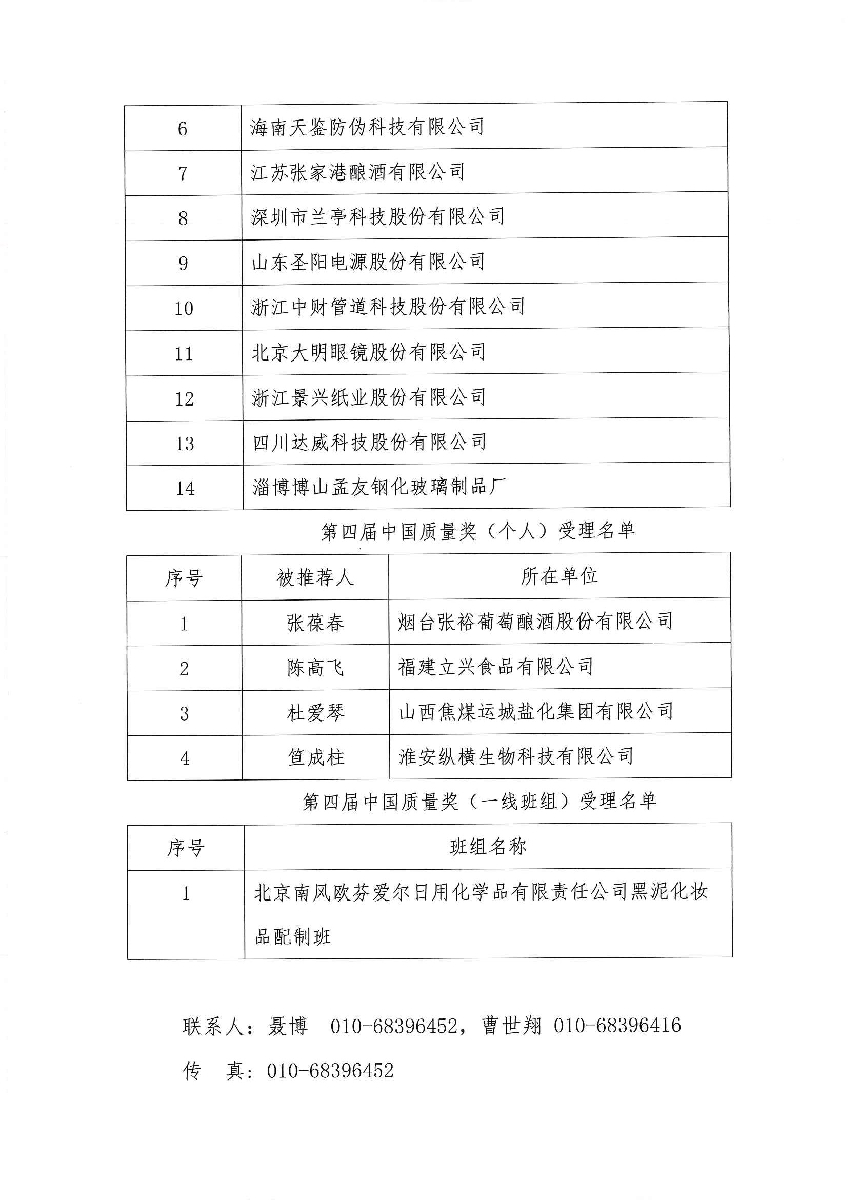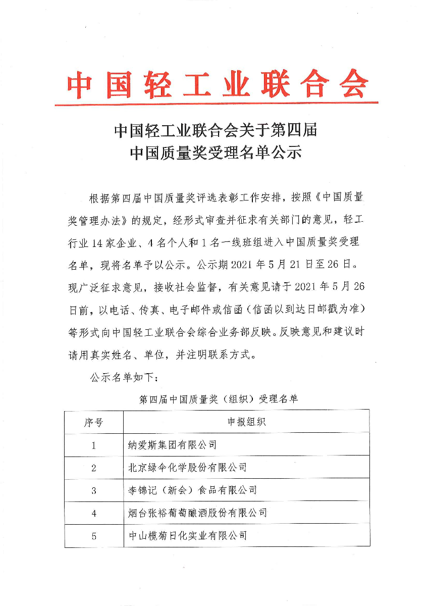中國(guó)輕工業(yè)聯(lián)合會(huì)關(guān)于第四屆中國(guó)質(zhì)量獎(jiǎng)受理名單公示