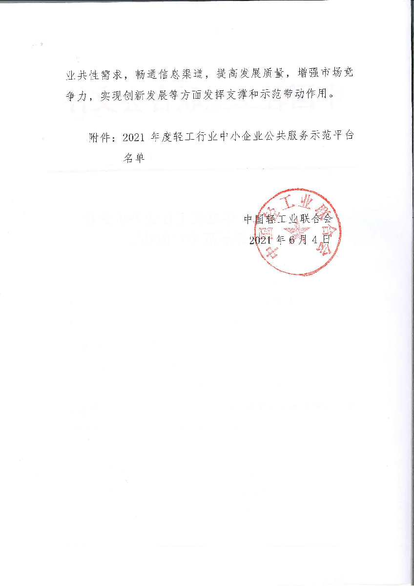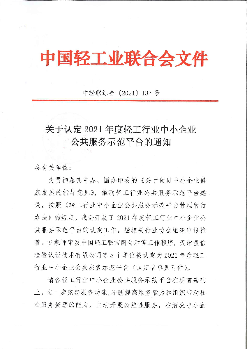 關(guān)于認(rèn)定2021年度輕工行業(yè)中小企業(yè)公共服務(wù)示范平臺(tái)的通知