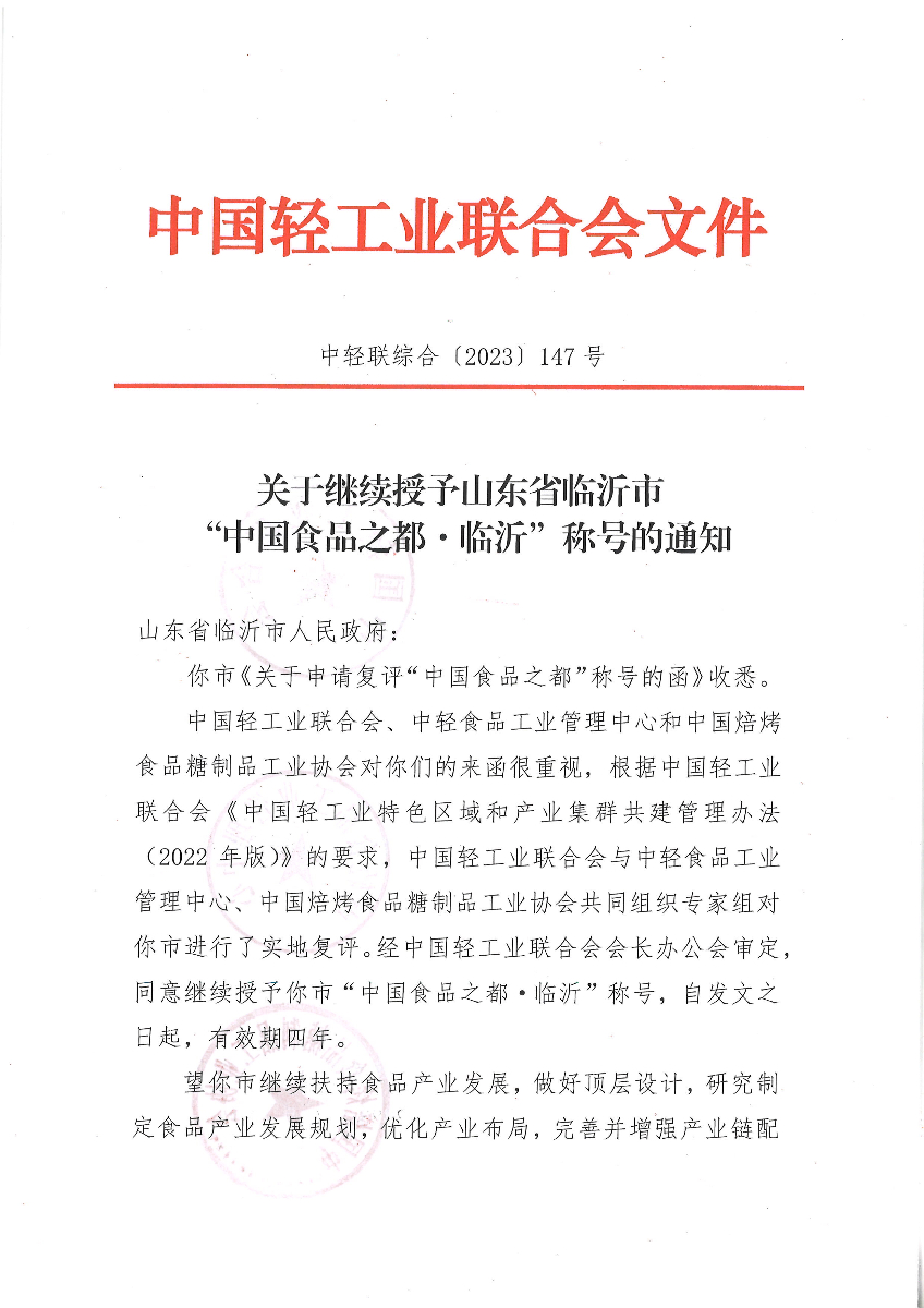關(guān)于繼續(xù)授予山東省臨沂市“中國食品之都·臨沂”稱號的通知