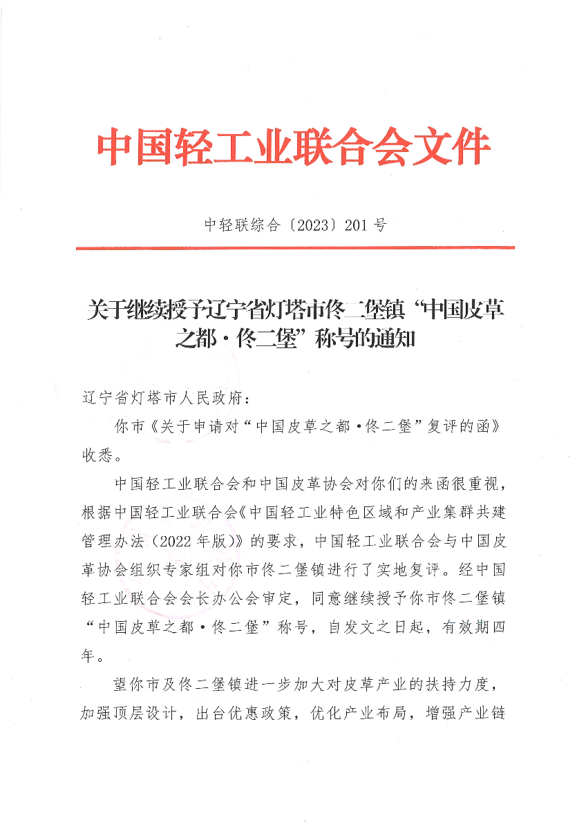 關于繼續(xù)授予遼寧省燈塔市佟二堡鎮(zhèn)“中國皮草之都·佟二堡”稱號的通知