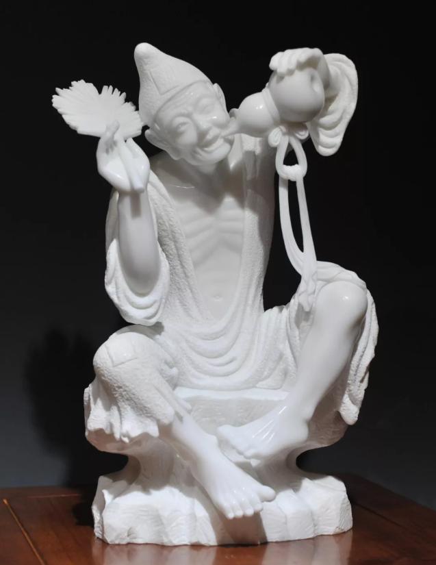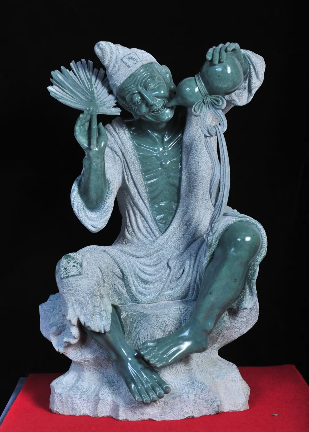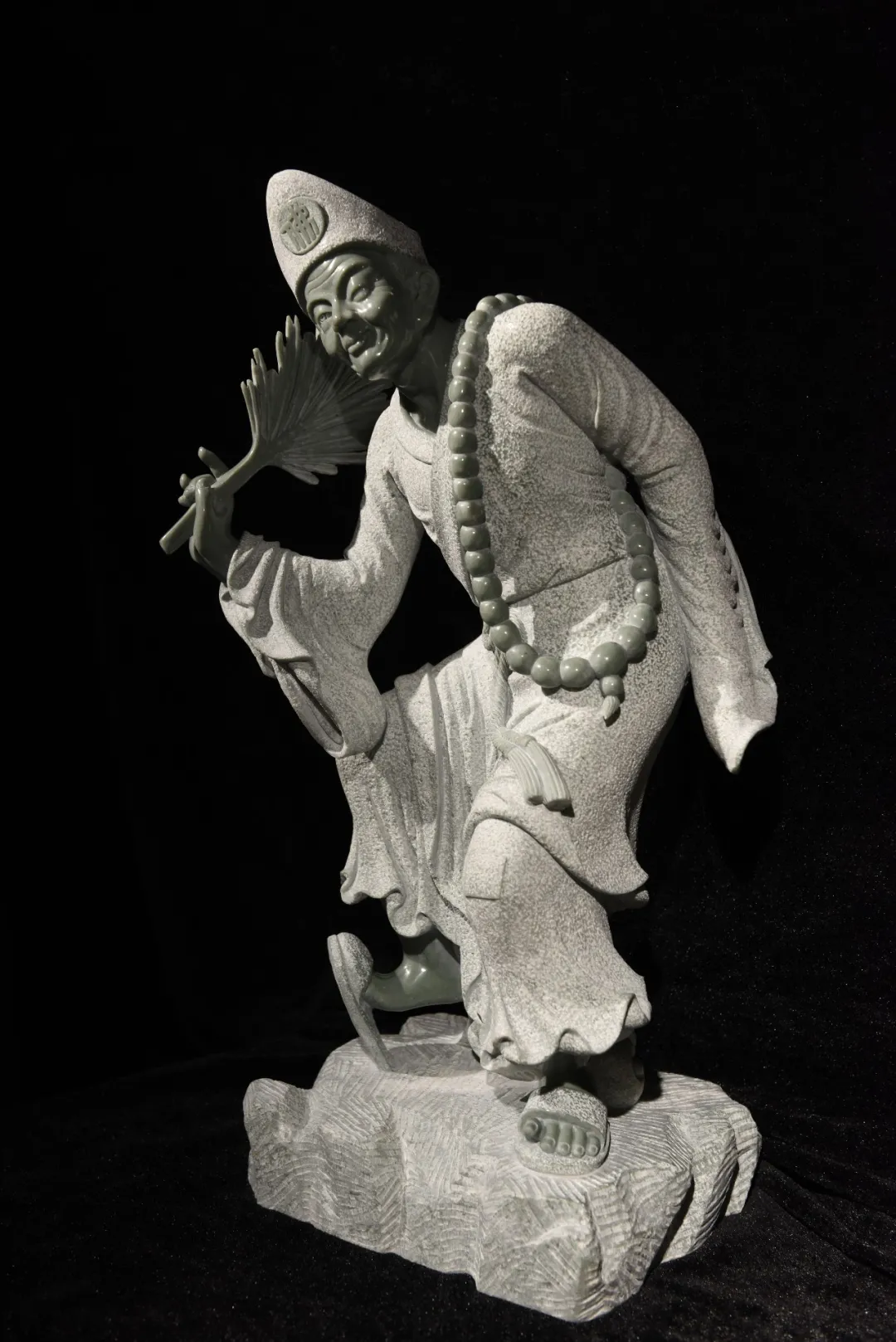 作品以優(yōu)質(zhì)漢白玉為原材料,運用粗糙面、光滑面技法處理,塑造了嗜好酒肉、舉止似癡若狂的濟(jì)公形象。濟(jì)公破帽破扇垢衲衣,光著雙腳坐于石頭之上,一手持扇,一手執(zhí)酒葫蘆,歪著腦袋咧開嘴,對著葫蘆做一副想要暢飲的模樣,形象生動,栩栩如生。