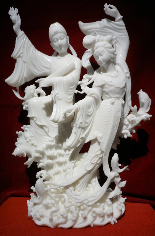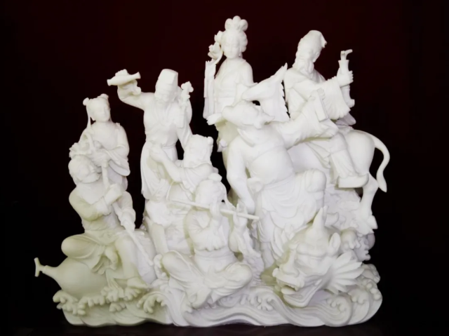 作品用漢白玉群雕塑造了“八仙過海”這一家喻戶曉、膾炙人口的神話故事。八仙應(yīng)白云大仙之約去間苑赴牡丹會,歸時路過東海,他們乘著酒興,各顯神通,浮海而過。創(chuàng)作者憑借嫻熟的雕刻技法和多年積累的創(chuàng)作經(jīng)驗,對八仙的面貌、神情、姿態(tài)、性格及各自神物法器進(jìn)行了比較細(xì)膩的刻畫,使得每個人物個性鮮明,神態(tài)各異,栩栩如生。