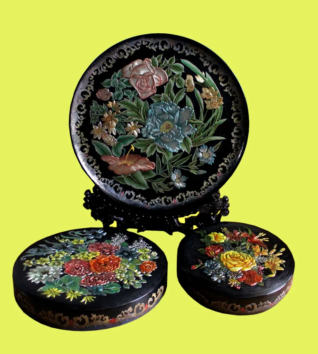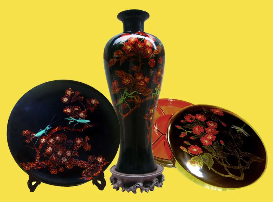 雕漆隱彩蟲趣三件套