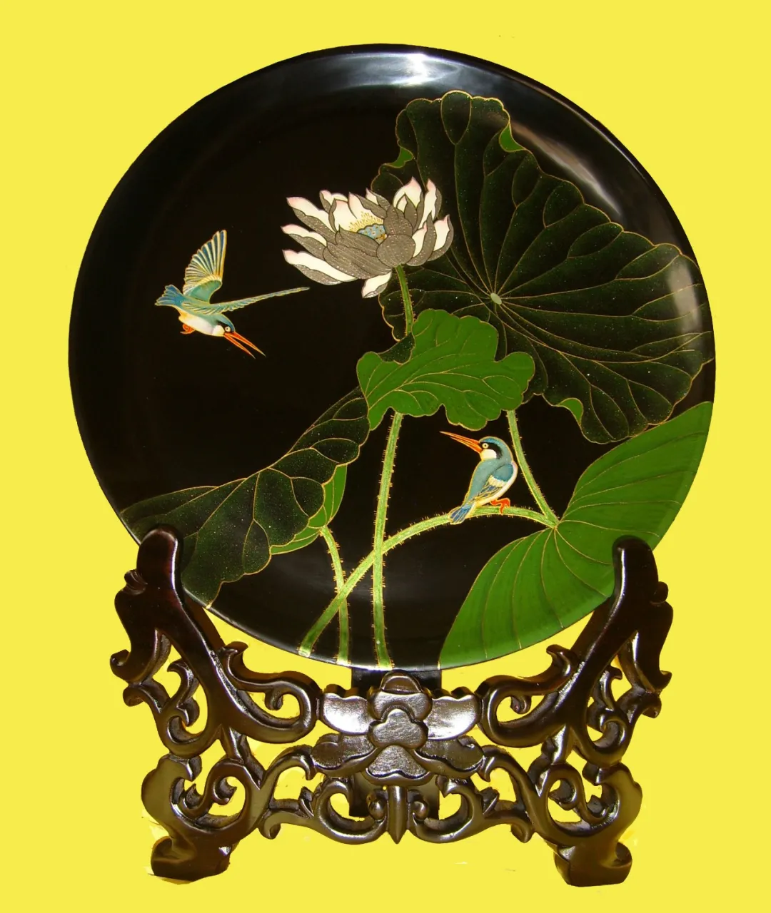 荷花翠鳥漆盤