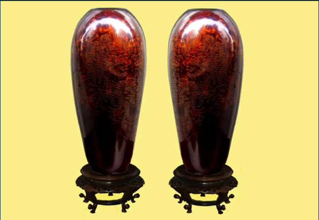 作品名稱:《雕漆瑪瑙紅隱花騰龍對瓶》