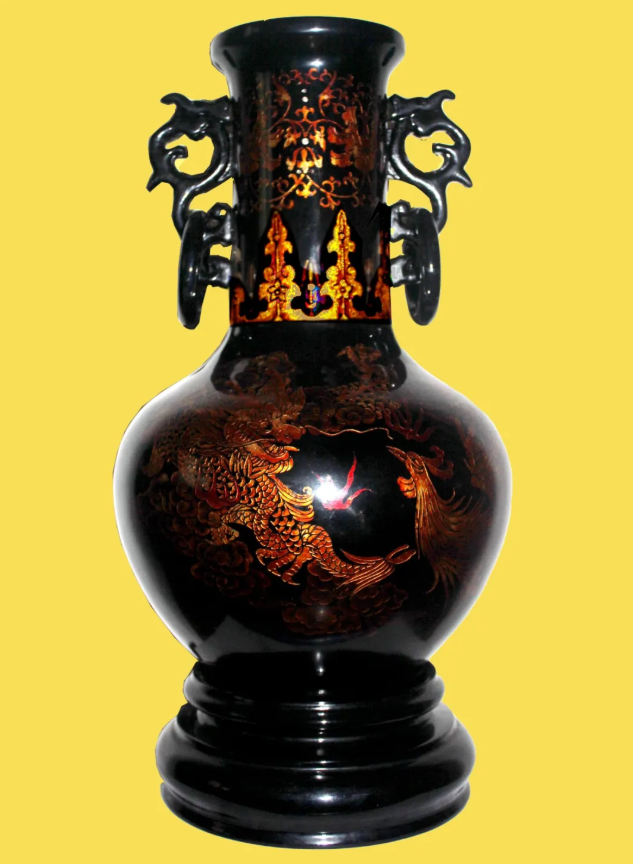 楊莉大師作品多以天然大漆為主要原料,以成都漆藝獨有的雕填、絲光、暈色等為主要裝飾技法,結合其自主研創(chuàng)的“層次隱花”、“薄鋁片轉繪”等新工藝,創(chuàng)作的漆盤、攢盒、對瓶等漆器作品器型古樸端莊,造型沉穩(wěn)大氣,做工精細考究,細節(jié)刻畫精準到位,整體色調莊重華麗,具有強烈的視覺沖擊力。作品大量運用龍鳳題材,立意高遠,寓意吉祥,龍飛九天,鳳舞九霄,尊貴華麗,氣勢恢宏,將中國傳統(tǒng)龍鳳圖騰的美學元素在漆器藝術中發(fā)揮到極致,令人嘆為觀止。