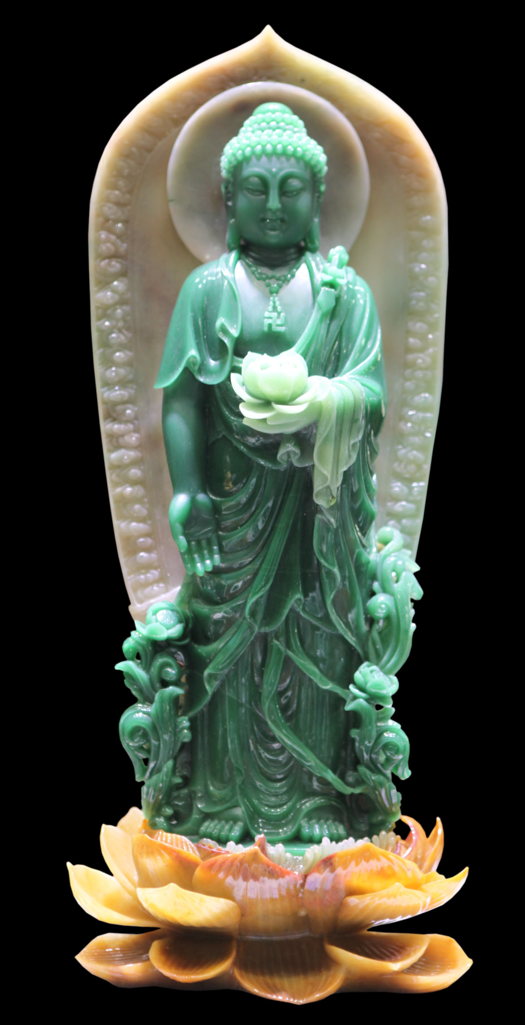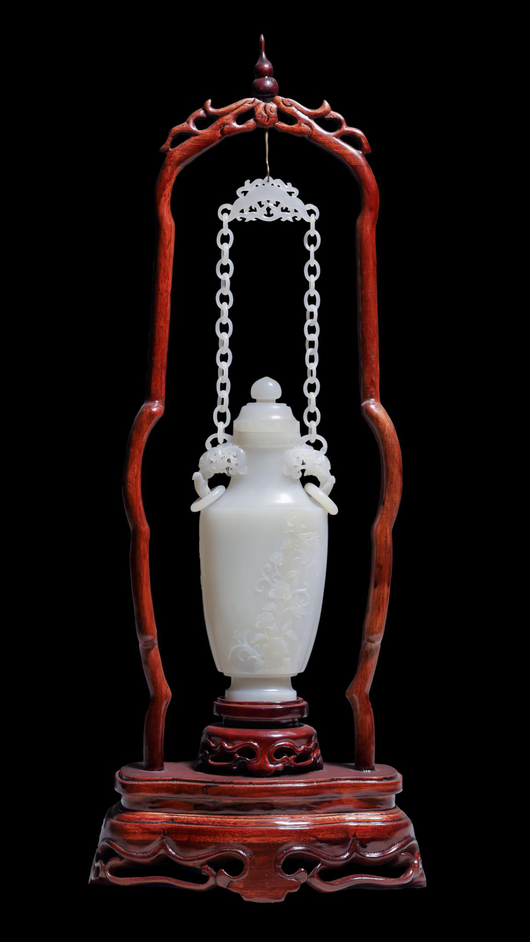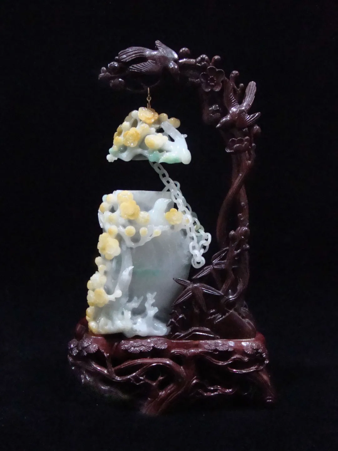 作品在色彩的摘取上獨具匠心,巧用翡翠的天然黃色,將其設計成傲雪爭艷的梅花,用綠色雕刻成翩翩起舞的喜鵲,瓶內(nèi)的鏈條增加了作品的內(nèi)涵,工藝精細獨到,彰顯了作者的深厚功底。