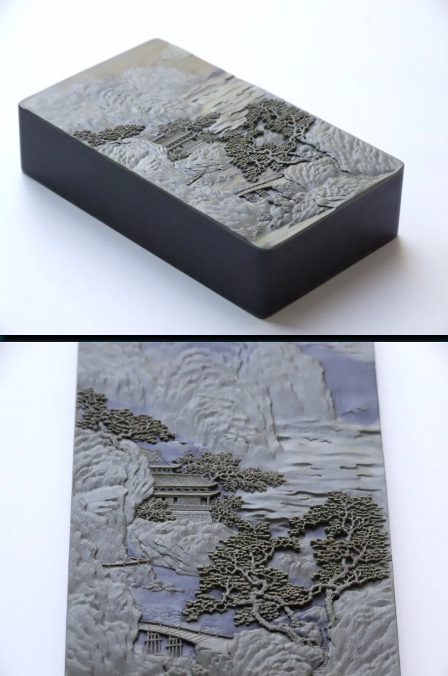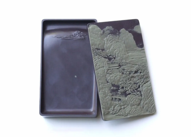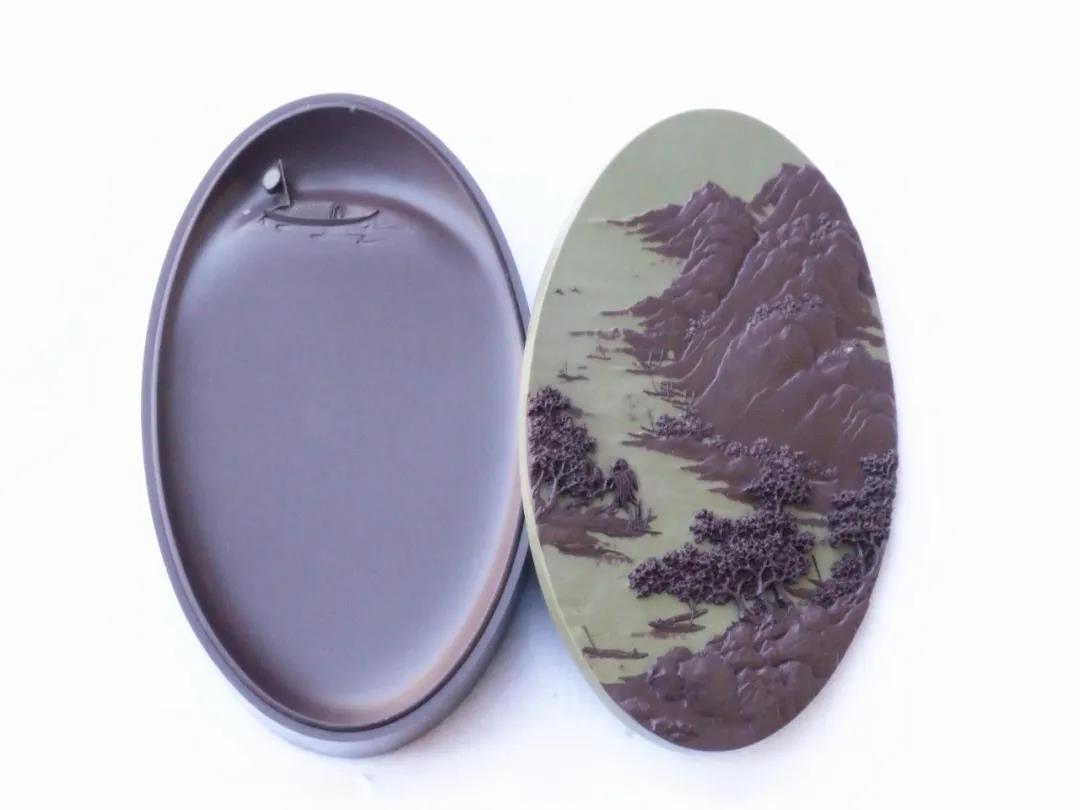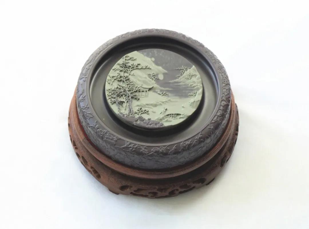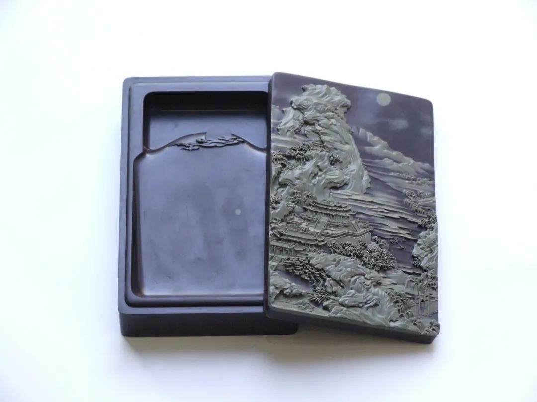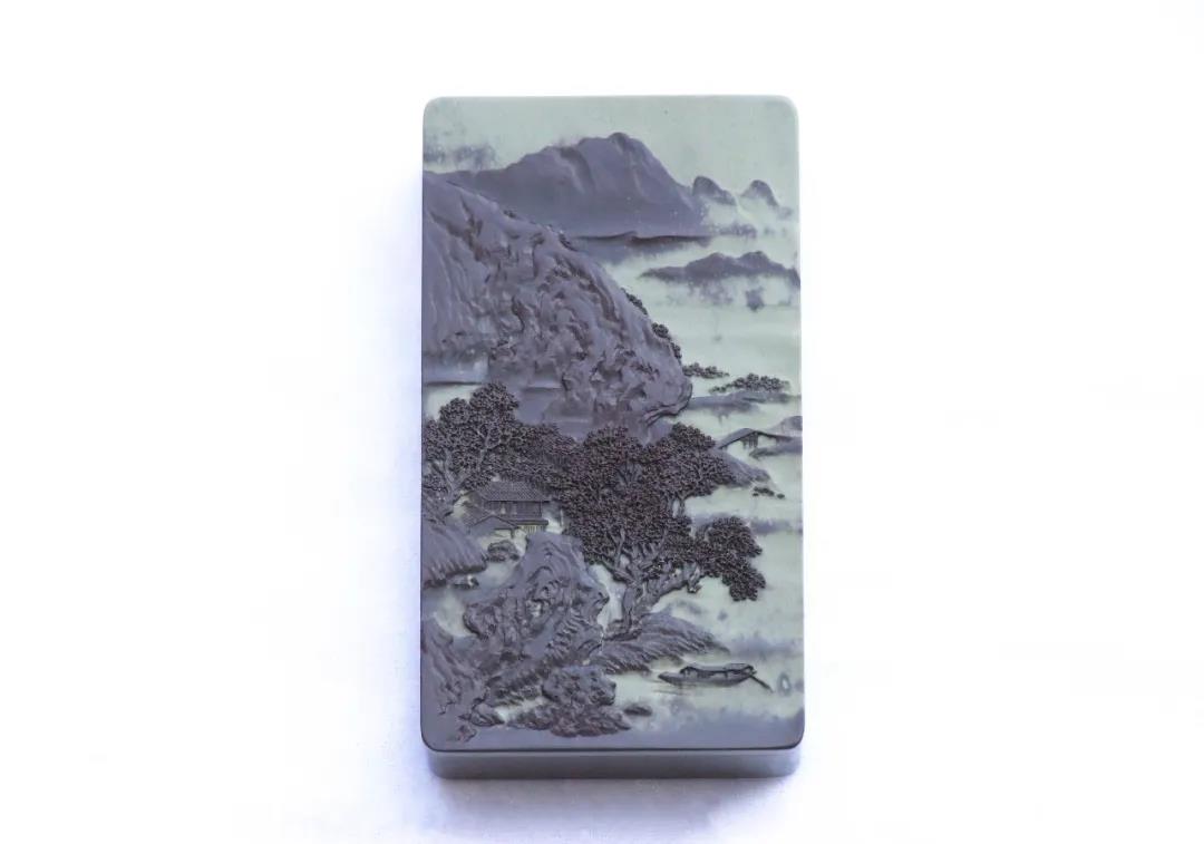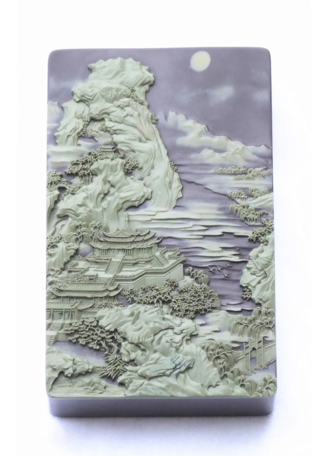 主硯與硯蓋均采用賀蘭石老坑硯石,石質(zhì)細膩溫潤,品質(zhì)極佳。作品題材參薦清代畫家袁江的《驪山避暑圖》,整體雕刻工藝精細入微,畫面栩栩如生,層次分明;主硯堂內(nèi)的明月與祥云安然祥和。作品立意以小見大,在有限的空間雕刻出宏大的場景,意境深遠,實用性、觀賞性與藝術(shù)性俱佳。