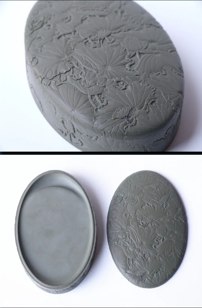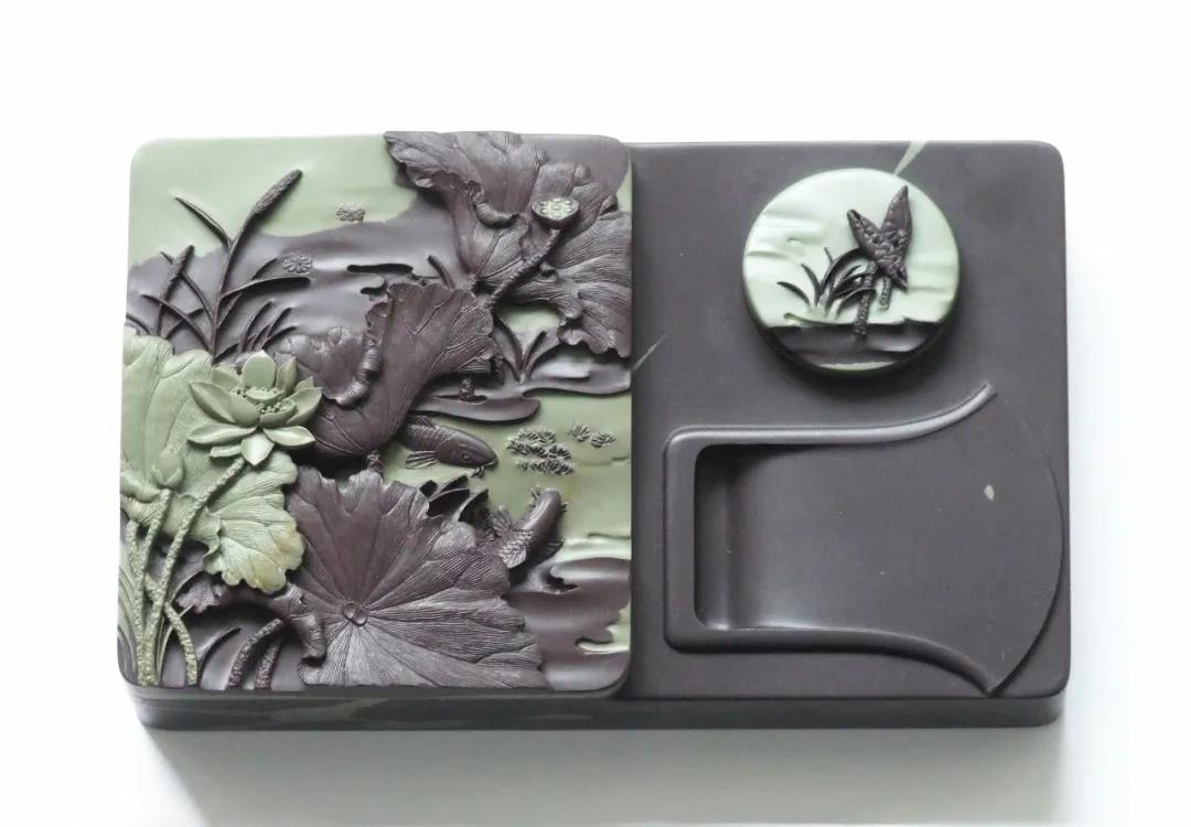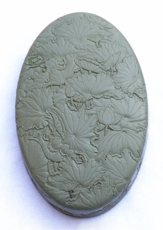 作品選用優(yōu)質(zhì)賀蘭石老坑硯石,用料講究。硯蓋與硯底精選綠色賀蘭石精雕荷葉與荷花,雕工精細,疏密有致,郁郁蔥蔥。以“荷氣一塘”為名,寓意和氣一堂,欲表達和和美美、祥和吉利之意。