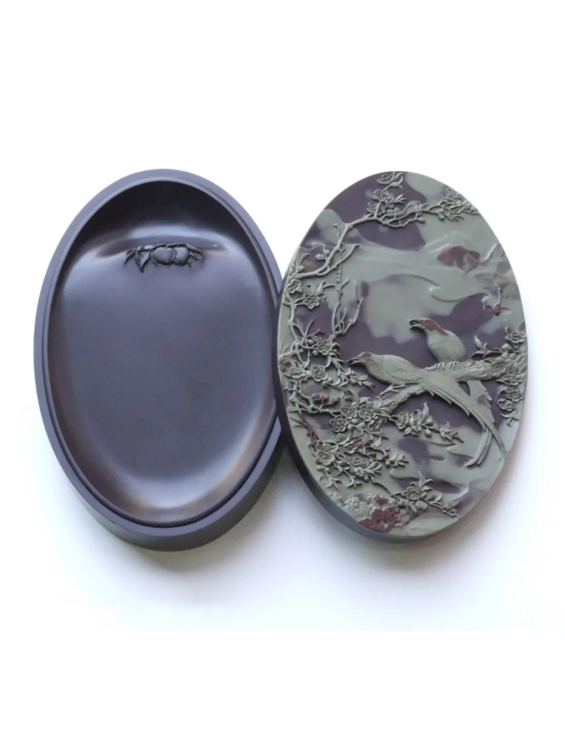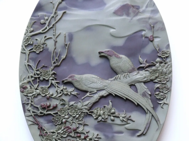 作品選用寧夏賀蘭石優(yōu)質(zhì)硯石,主硯石質(zhì)細膩嫩滑,硯蓋根據(jù)硯石紅鋼夾綠彩的層次,雕刻了兩只山雀在桃林中嘻戲的場景。賀蘭石的石質(zhì)在紅鋼和綠彩俏色的運用上得到了很好的體現(xiàn),整件作品意境豐滿,雕工精美,刻畫了桃花盛開后生機勃發(fā),鳥兒喜慶愉悅的歡快場景。