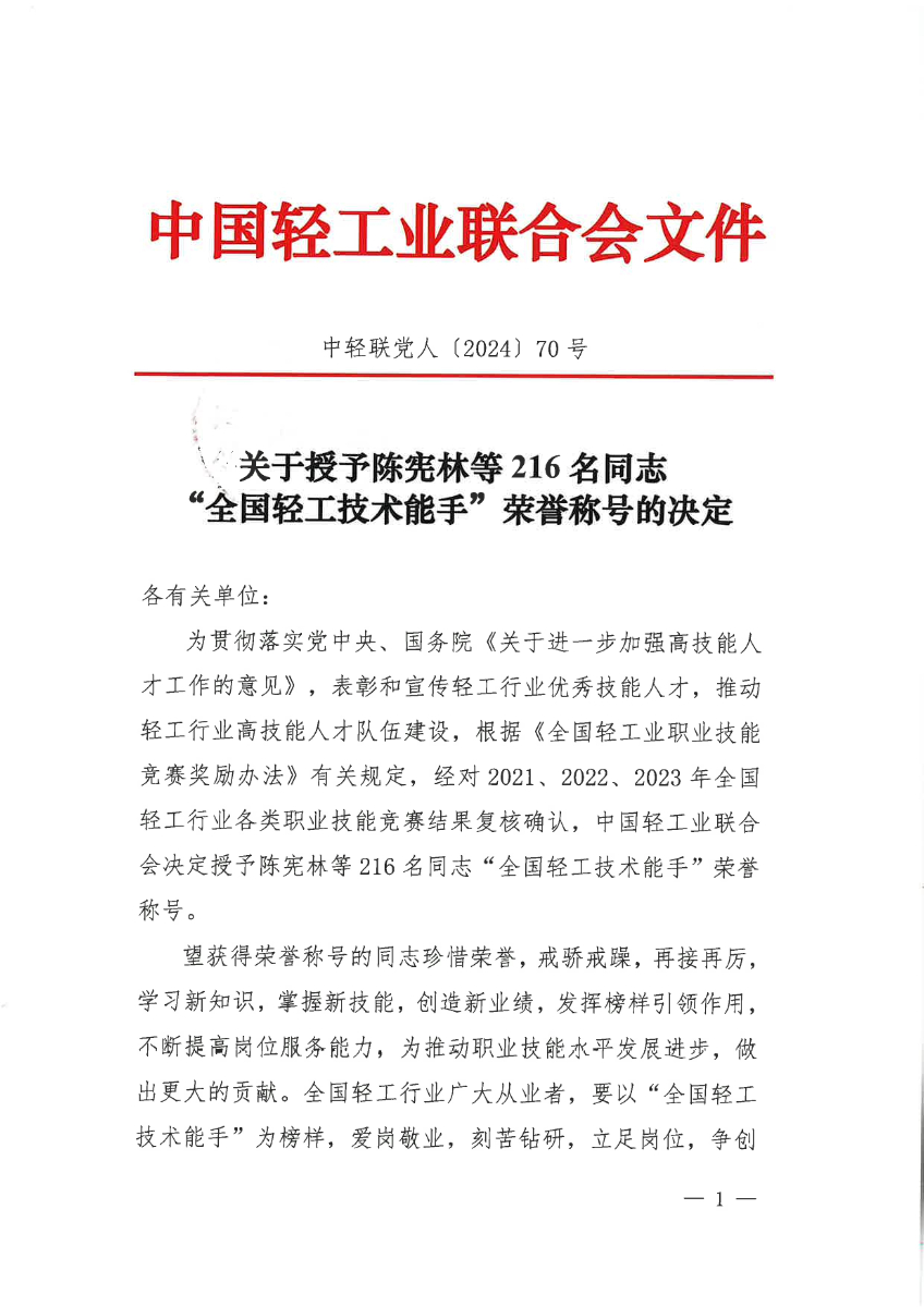 關(guān)于授予陳憲林等216名同志“全國(guó)輕工技術(shù)能手”榮譽(yù)稱號(hào)的決定