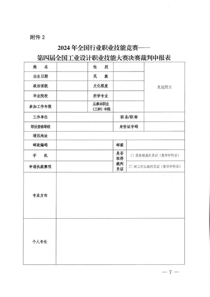 附件2 2024年第四屆全國(guó)工業(yè)設(shè)計(jì)職業(yè)技能大賽決賽裁判申報(bào)表.docx